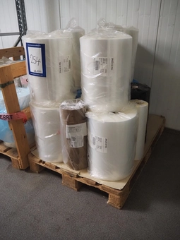 Pallet with various plastic film rolls for thermoformer, film width: 560 mm, 435 mm, 420 mm, 565 mm and 430 mm.0 bidsLot is closed -