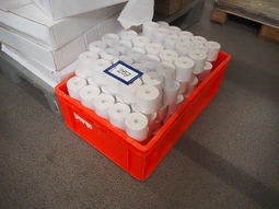 Plastic crates with paper rolls, roll width: 57 mm, total dimensions: 600 mm x 400 mm x 200 mm.1 bidLot is closed -