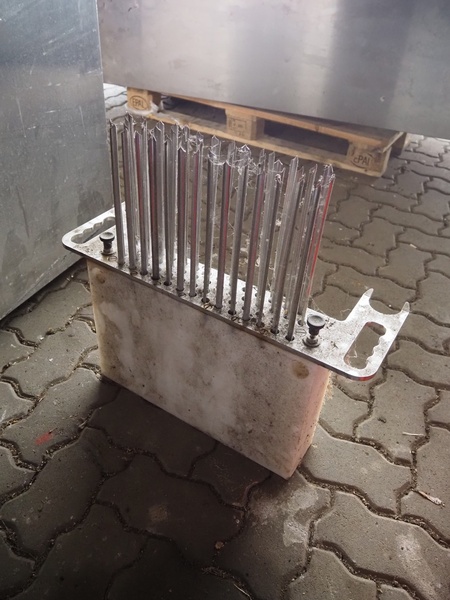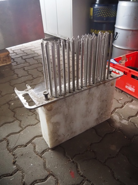 Rühle injector with lifter for crates, type: IR 56, number: 0293, year of construction: 2007, 400 V, 3 Ph, 50 Hz, 16 A, 7.5 kW, 56 needles, s/s walking beam, beam width: 340 mm, total dimensions: 1800 mm x 800 mm x 2000 mm. Including crate with parts.