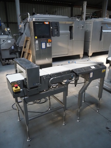 Anritsu metal detector and checkweigher, type: KW5412AP3D, serial number: 4600197517, year of construction: 2013, 300 V, 1 Ph, 50/60 Hz, 1.5 kA, plastic belt, belt width: (2x) 250 mm, clearance: 300 mm x 80 mm, total dimensions: 860 mm x 670 mm x 1590 mm. Including transport belt with ejector, dimensions: 700 mm x 440 mm x 970 mm.