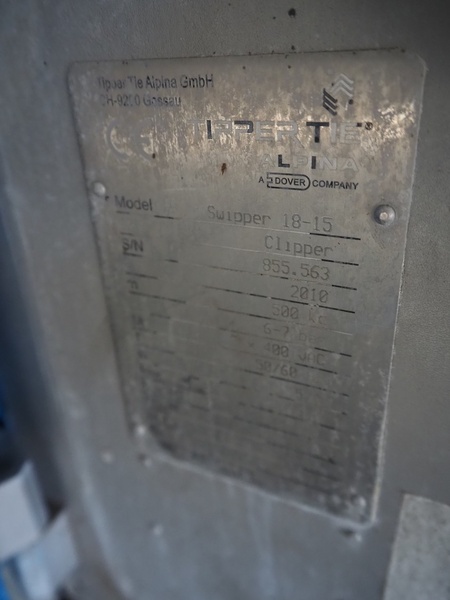Tipper Tie Alpina double clipper, type: Swipper 18-15, serial number: 855.563, year of construction: 2010, 400 V, 3 Ph, 50/60 Hz, 15 A, 6-7 bar, dimensions: 1250 mm x 1100 mm x 2120 mm. Missing matrix and outfeed conveyor. Technical condition unknown.