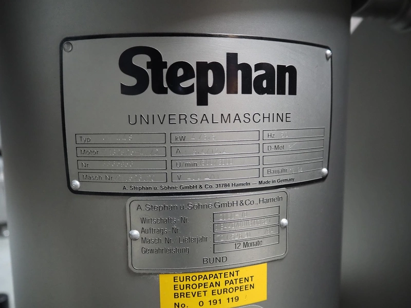 Stephan universal machine, type: UM 44S, serial number: 3365956, machine number: 721.526.20, year of construction: 1994, 400 V, 3 Ph, 50 Hz, 9.4/12.4 A, 4/5.5 kW, s/s bowls, bowl dimensions: 500 mm x 300 mm, 300 mm x 315 mm, total dimensions: 1400 mm x 600 mm x 1200 mm.