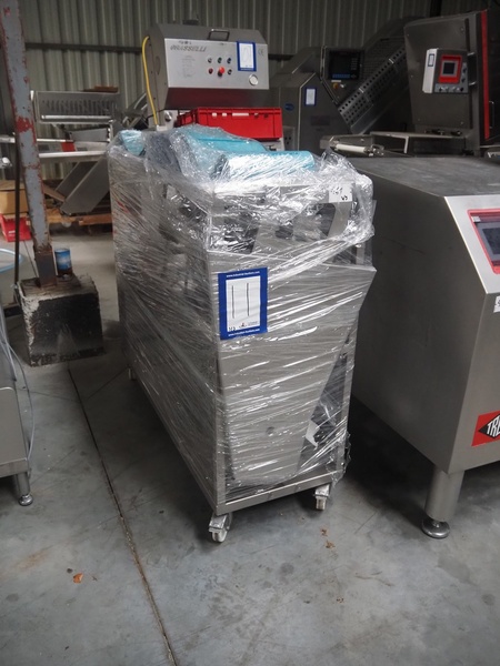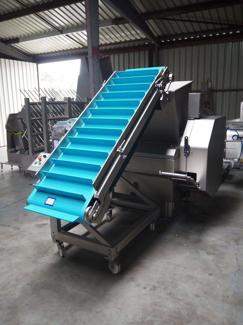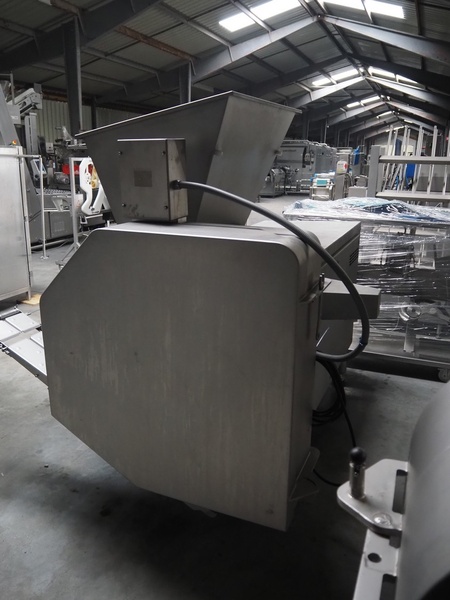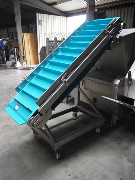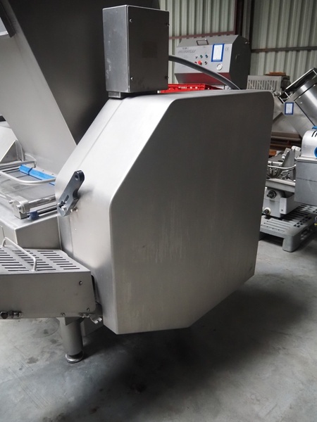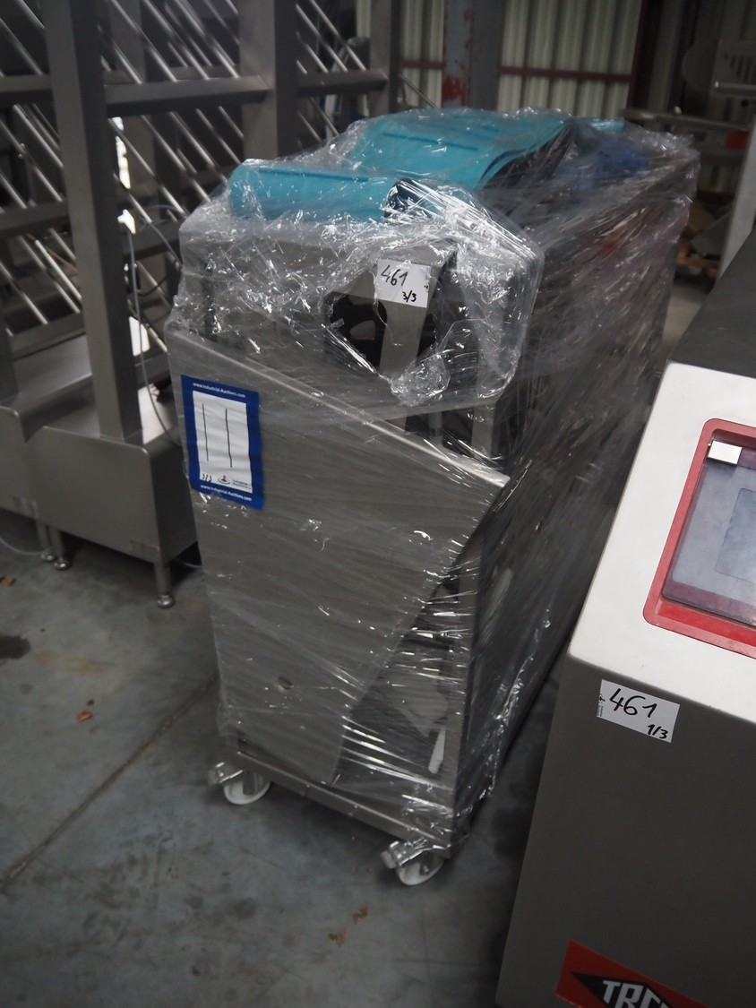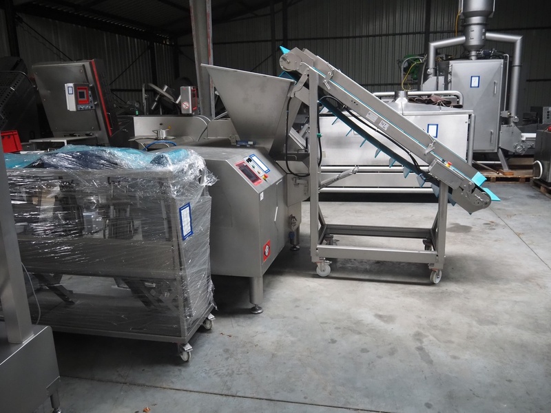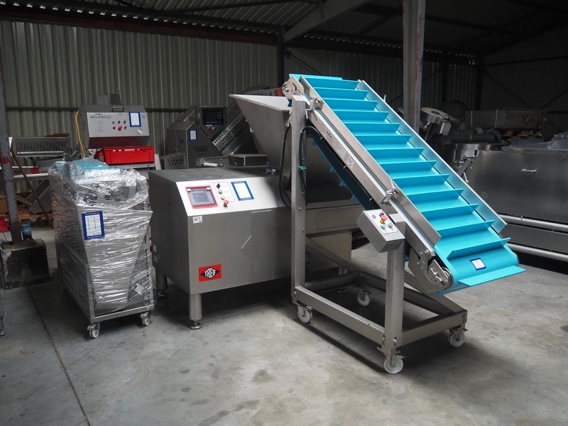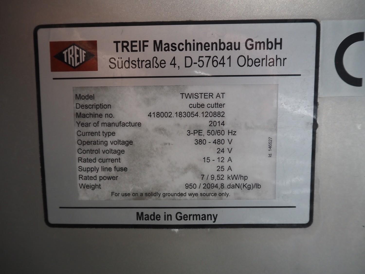 Treif Maschinenbau GmbH dicer, type: TWISTER AT, machine number: 418002.183054.120882, year of construction: 2014, 24/380/480 V, 3 Ph, 50/60 Hz, 12/15/25 A, 7/9.52 kW, plastic belt, belt width: 250 mm, total dimensions: 2050 mm x 1950 mm x 1850 mm. Including mobile elevating belt, s/s frame, plastic belt with dividers, belt width: 630 mm, distance between dividers: 140 mm, divider height: 85 mm, elevating height: 1920 mm, total dimensions: 1750 mm x 960 mm x 2015 mm and s/s tool trolley, dimensions: 1450 mm x 500 mm x 1320 mm.