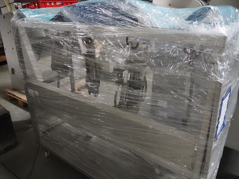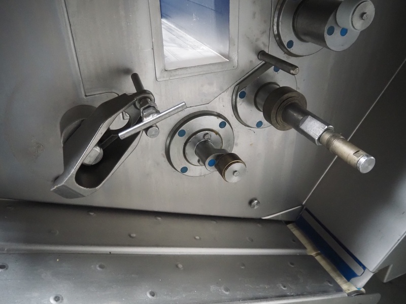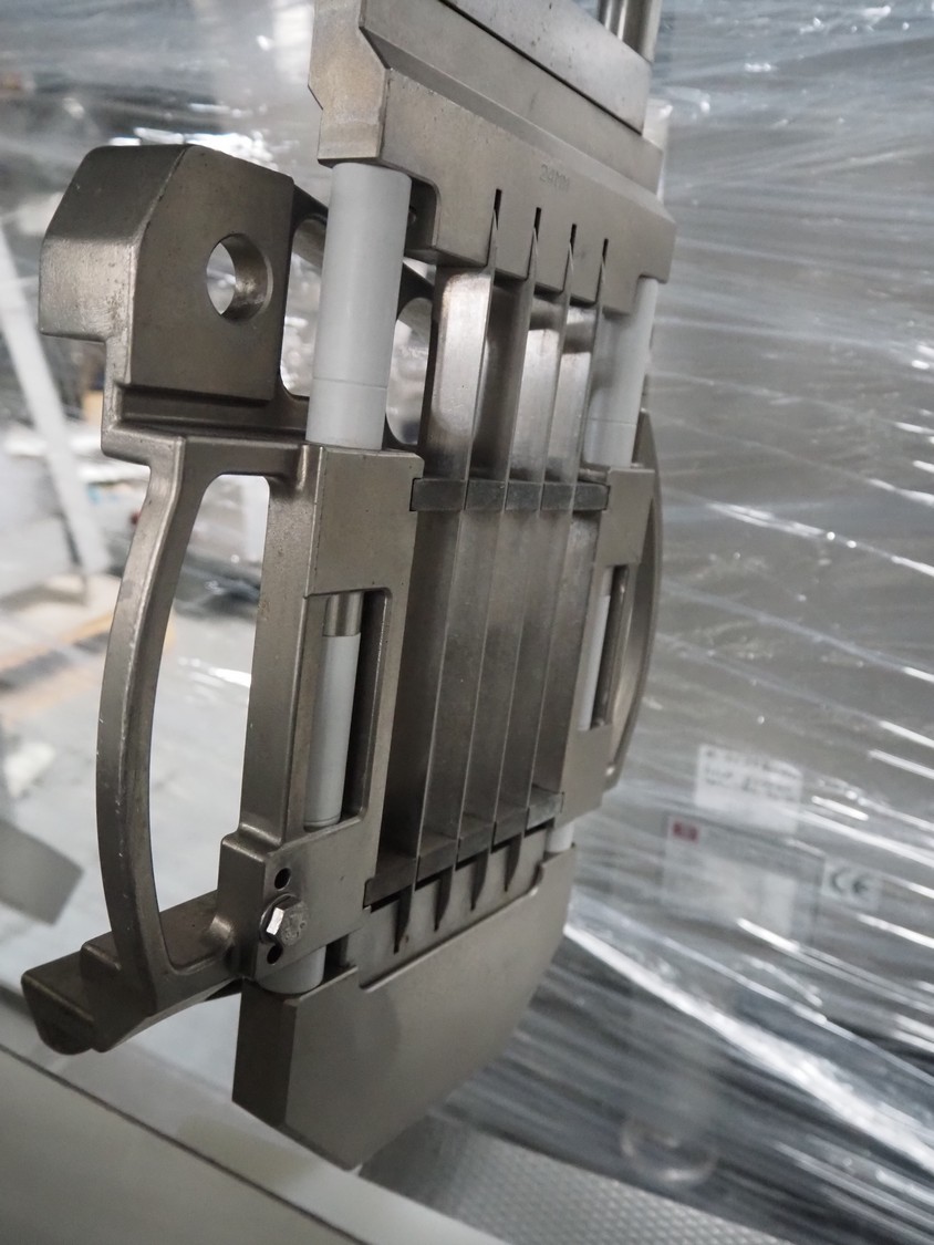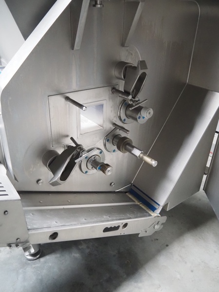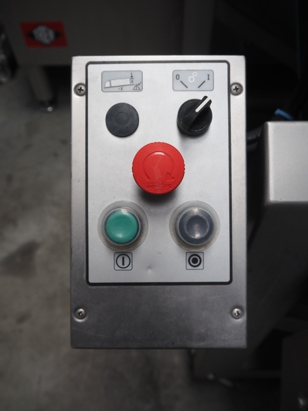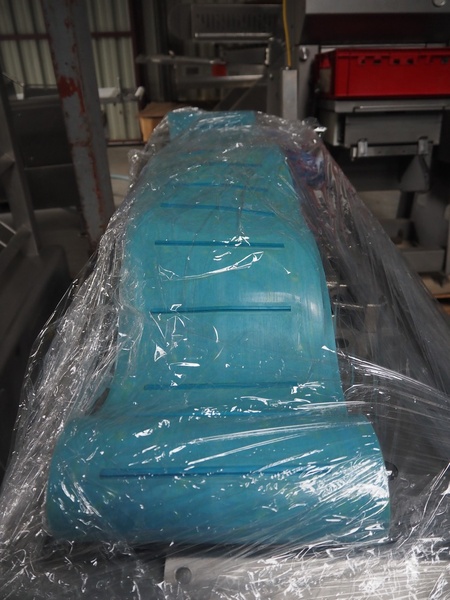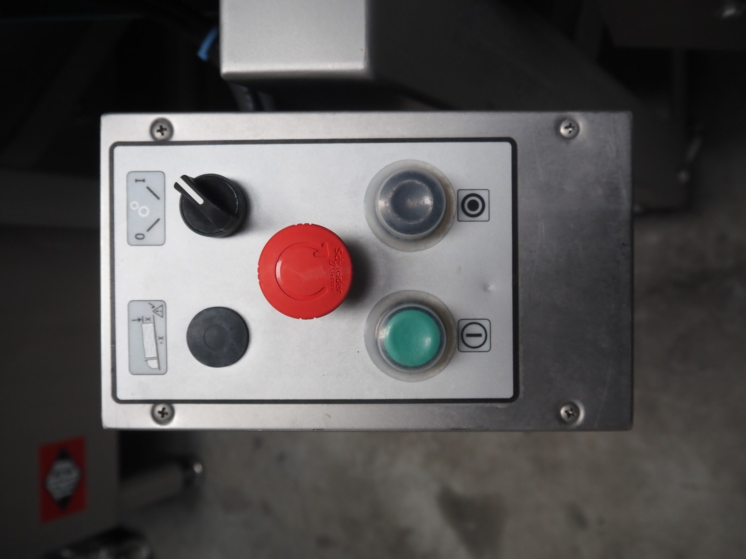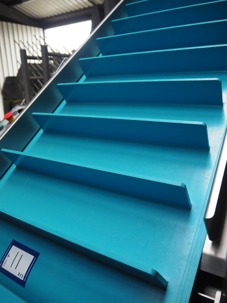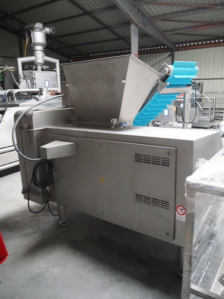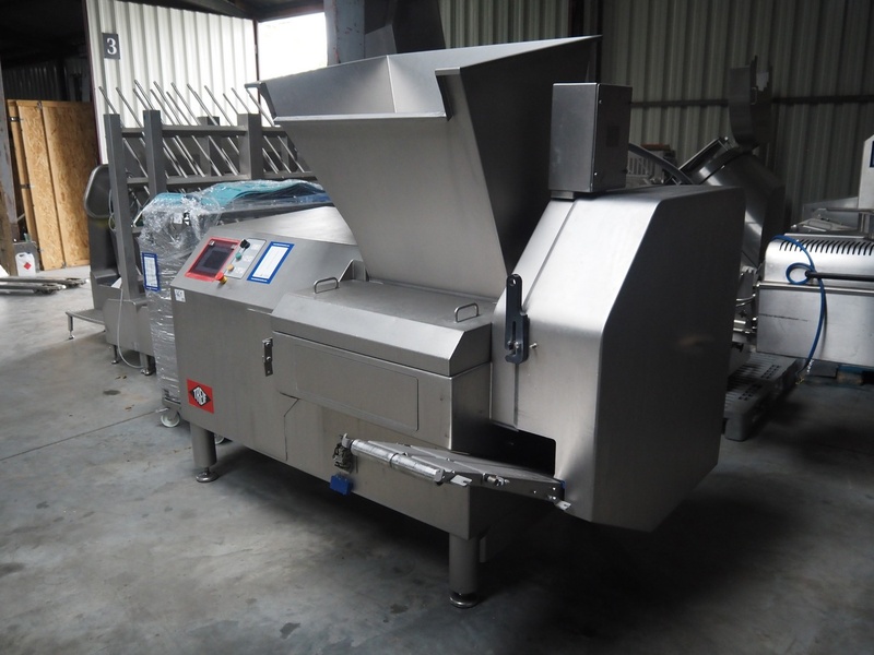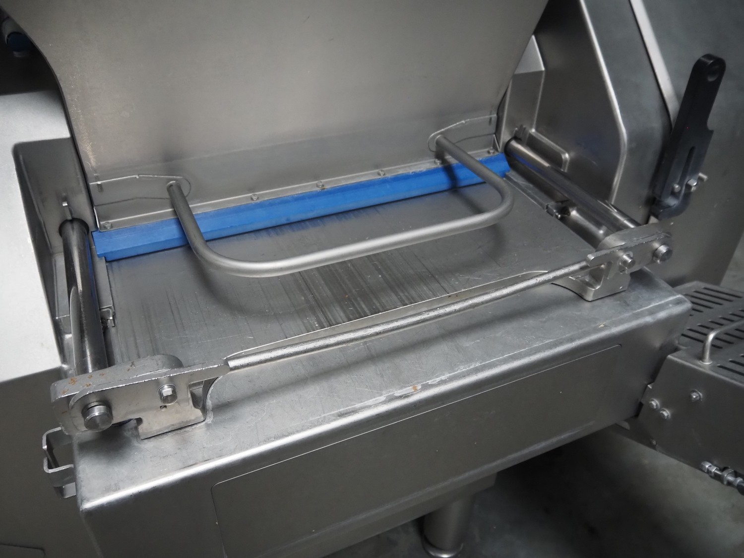 Treif Maschinenbau GmbH dicer, type: TWISTER AT, machine number: 418002.183054.120882, year of construction: 2014, 24/380/480 V, 3 Ph, 50/60 Hz, 12/15/25 A, 7/9.52 kW, plastic belt, belt width: 250 mm, total dimensions: 2050 mm x 1950 mm x 1850 mm. Including mobile elevating belt, s/s frame, plastic belt with dividers, belt width: 630 mm, distance between dividers: 140 mm, divider height: 85 mm, elevating height: 1920 mm, total dimensions: 1750 mm x 960 mm x 2015 mm and s/s tool trolley, dimensions: 1450 mm x 500 mm x 1320 mm.