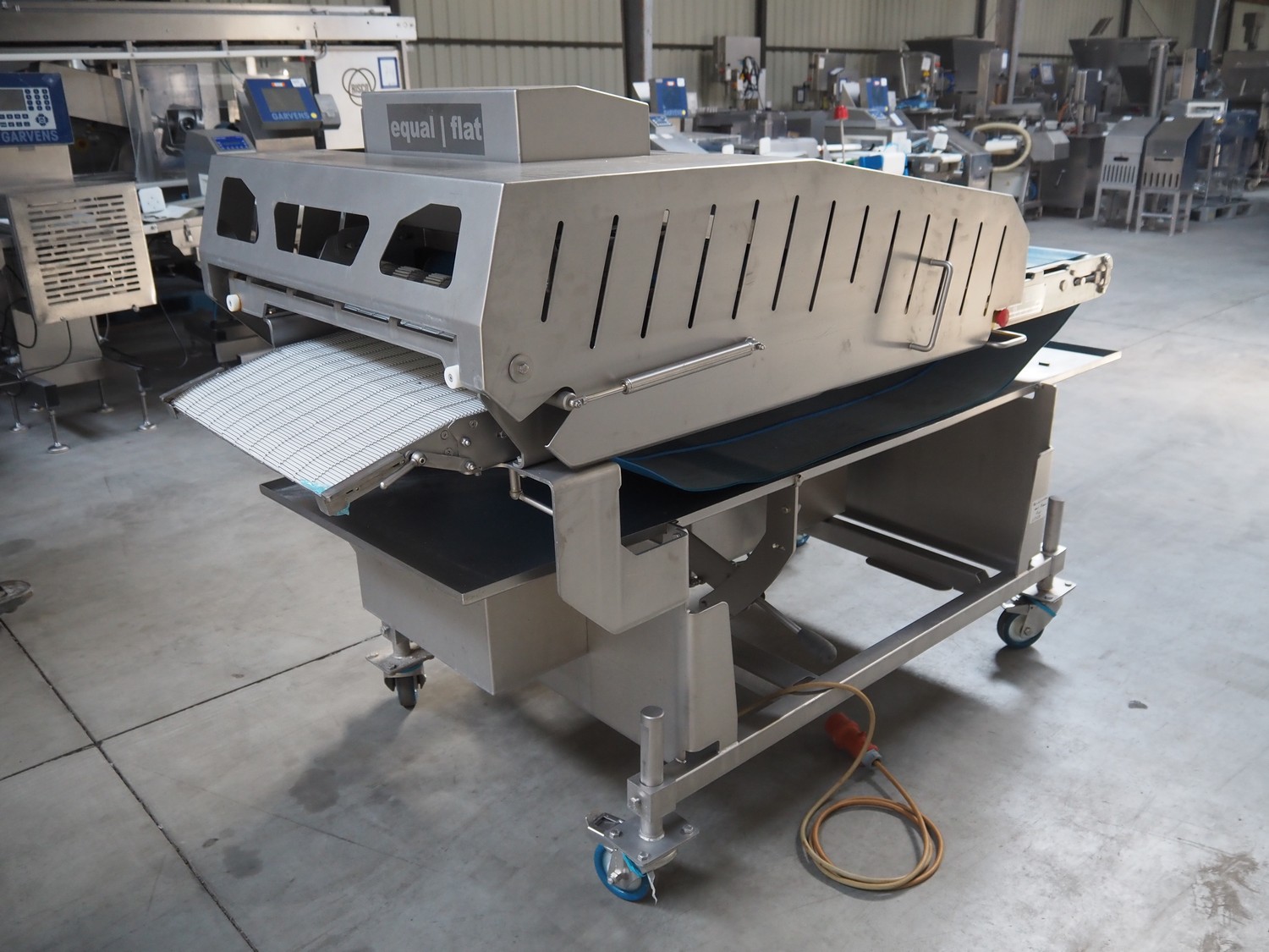 Alco food-machines GmbH & Co. KG mobile flattener, type: ASP600HDW, serial number: 31608218, year of construction: 2007, 400 V, 3.0 kW, machine weight: 750 kg, plastic belt, belt width: (2x) 600 mm, s/s mesh belt, belt width: 600 mm, clearance: 600 mm x 45 mm, total dimensions: 2000 mm x 1050 mm x 1410 mm.