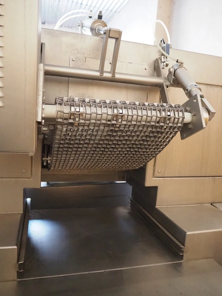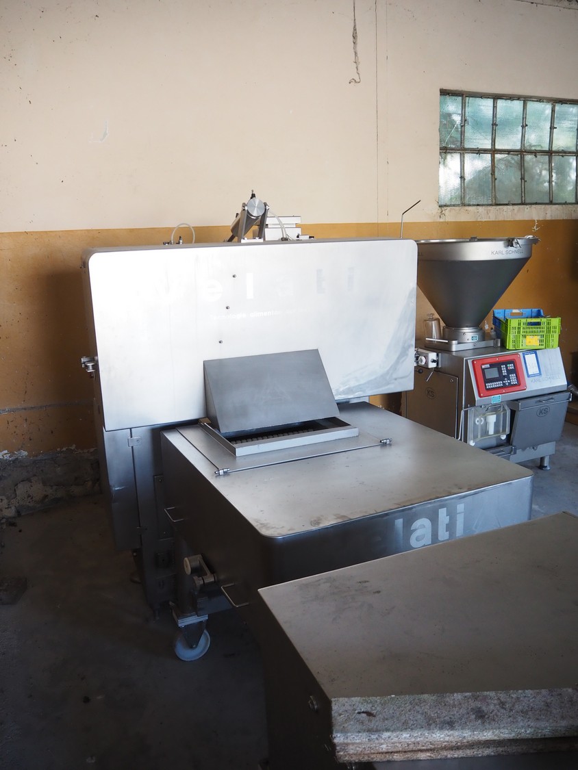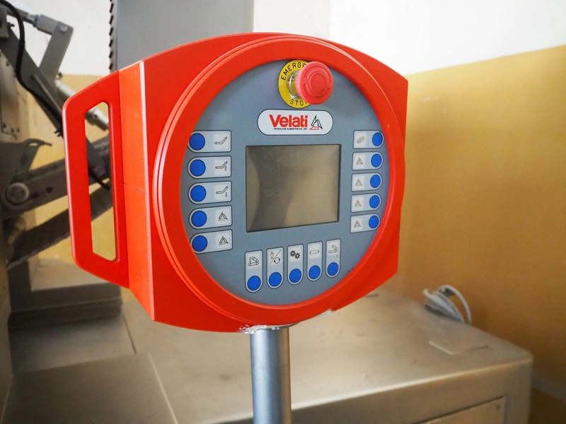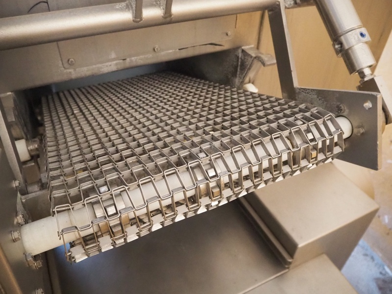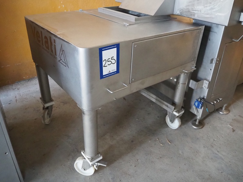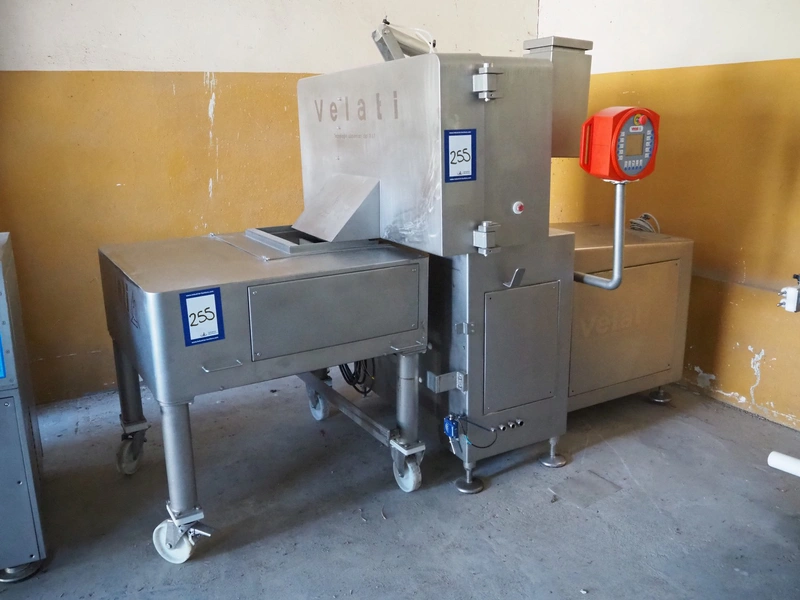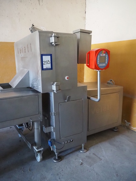 Velati continuous frozen meat cutter, model: Q.E. Tagliacarne F/3, serial number: 069-Q-T.04, year of construction: 09/2004, 400 V, 50 Hz, 59 A, 27 kW, s/s mesh belt, belt width: 400 mm, total dimensions: 2100 mm x 1600 mm x 2200 mm and 1200 mm x 1050 mm x 1150 mm.