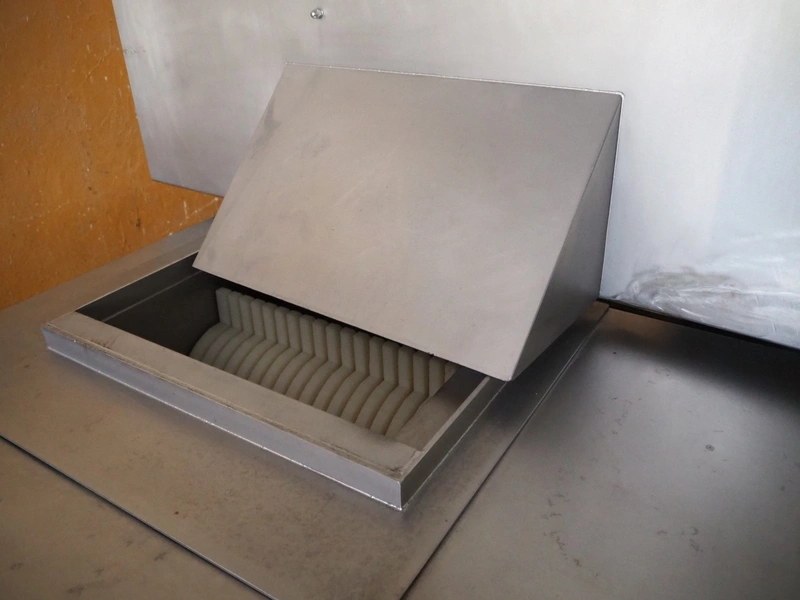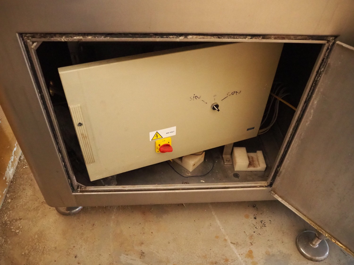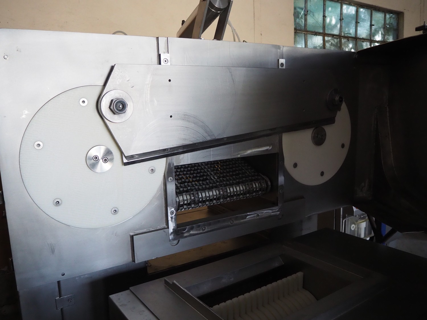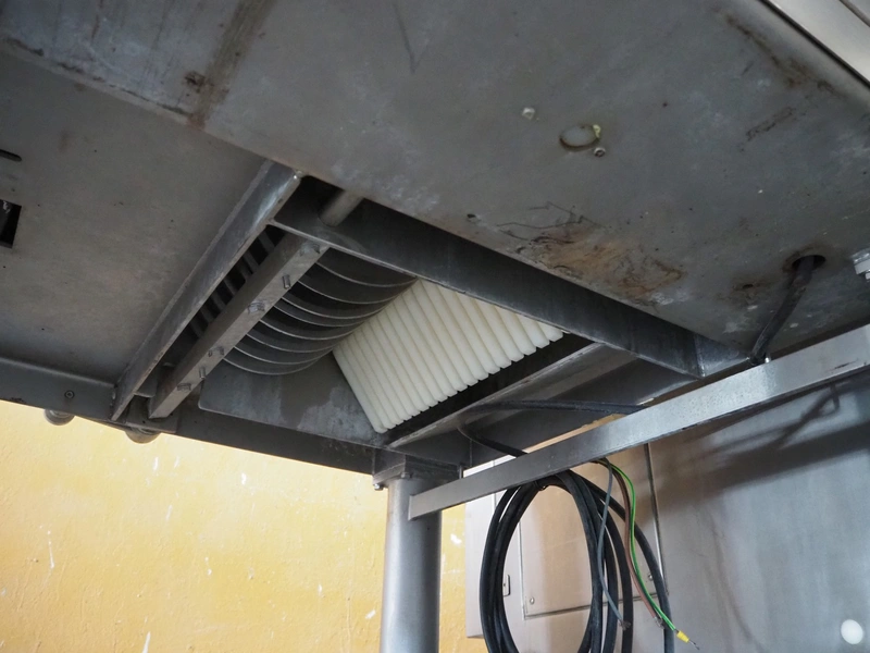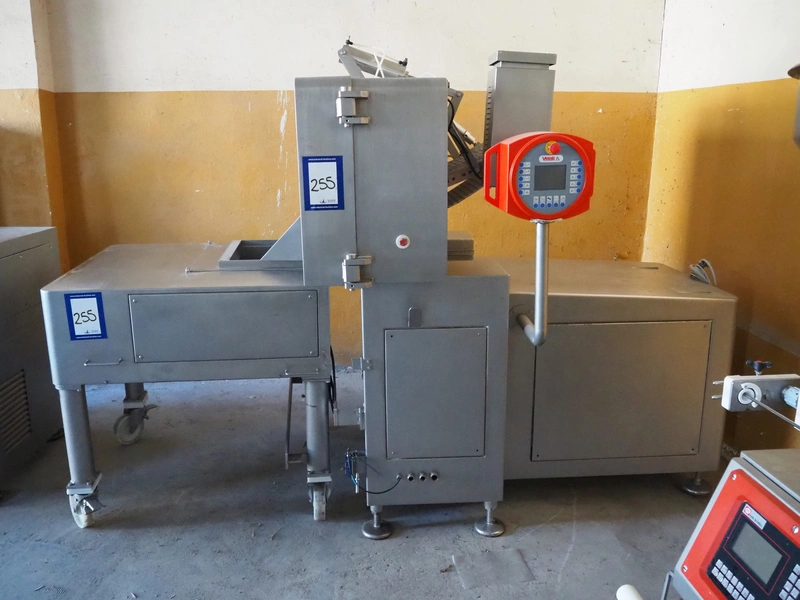 Velati continuous frozen meat cutter, model: Q.E. Tagliacarne F/3, serial number: 069-Q-T.04, year of construction: 09/2004, 400 V, 50 Hz, 59 A, 27 kW, s/s mesh belt, belt width: 400 mm, total dimensions: 2100 mm x 1600 mm x 2200 mm and 1200 mm x 1050 mm x 1150 mm.