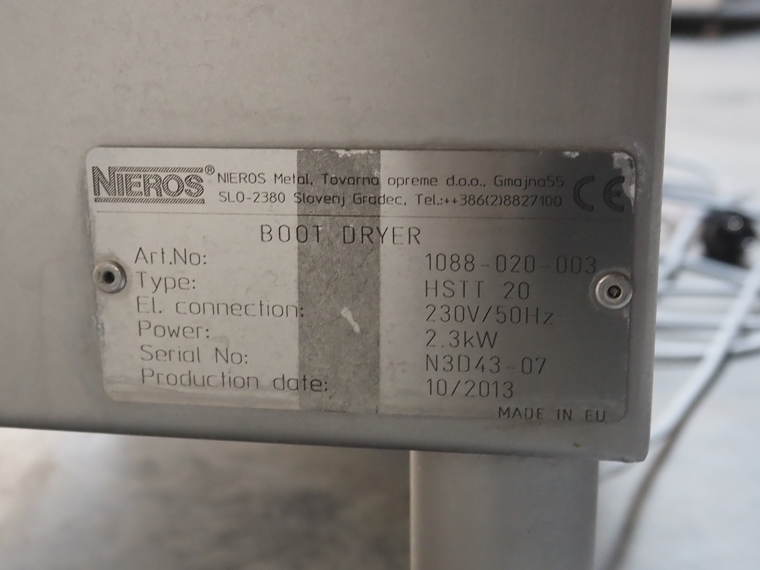 Nieros heated boot dryer, type: HSTT 20, serial number: N3D43-07, article number: 1088-020-003, year of construction: 10/2013, 230 V, 50 Hz, 2.3 kW, for 20 pairs of boots, total dimensions: 1610 mm x 455 mm x 1910 mm.