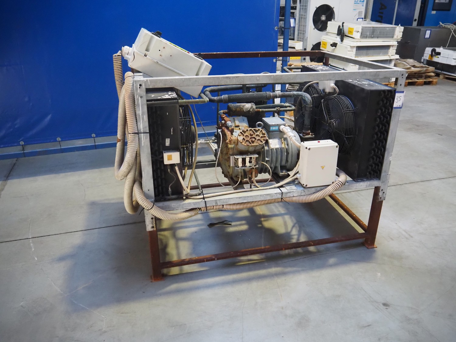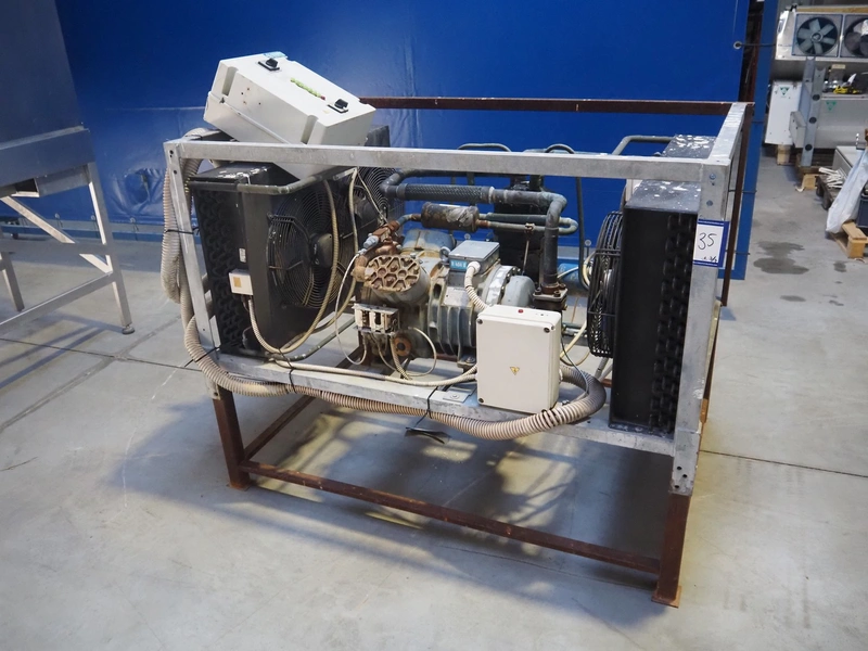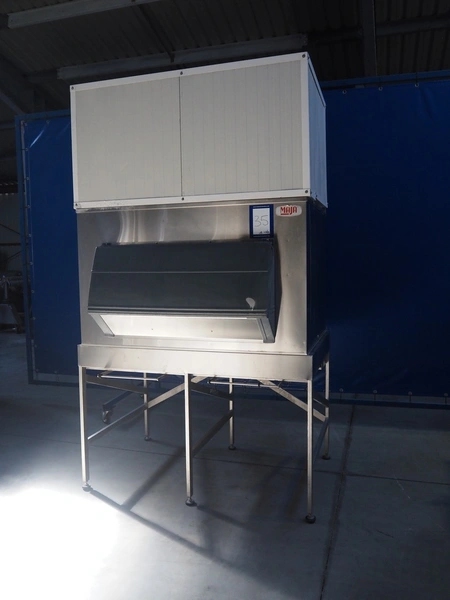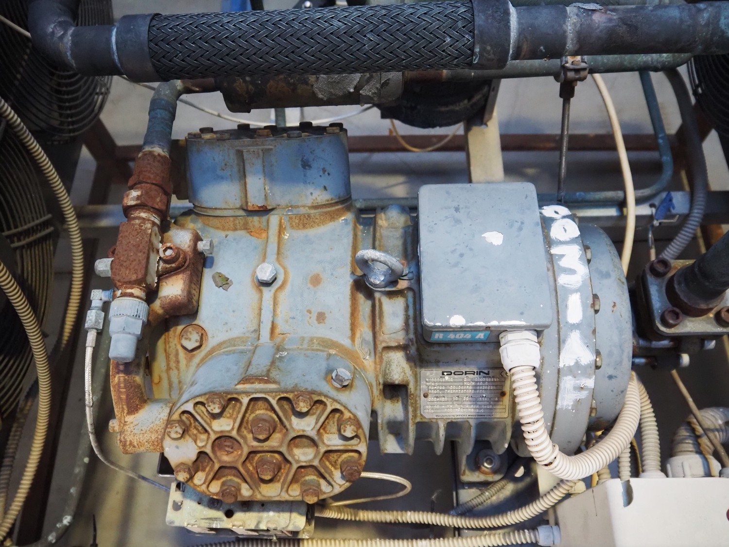 Maja ice machine with Dorin cooling compressor, type compressor: K1000CS, serial number: 020719110, 380/420 V, 3 Ph, 50 Hz, 7.4 kW, 1450 rpm, dimensions cooling compressor: 1450 mm x 1000 mm x 1150 mm, dimensions Maja ice machine: 1600 mm x 1200 mm x 2750 mm.