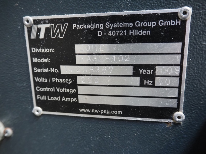ITW Packaging Systems Group GmbH mobile strapping machine, model: B A32-102, serial number: 14258367, year of construction: 2008, 230 V, 50 Hz, clearance: 330 mm x 210 mm, total dimensions: 1070 mm x 570 mm x 1500 mm.