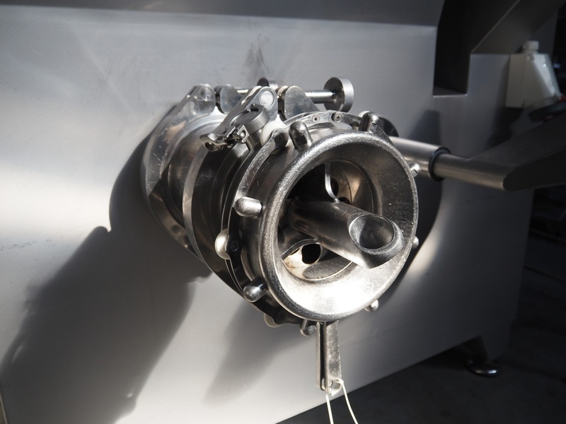 Carnitech grinder, model: CT3113, type: ON 23960 00, serial number: 04-2063, year of construction: 2005, 400 V, 3 Ph, 50 Hz, plate diameter: 225 mm, total dimensions: 2200 mm x 2150 mm x 2450 mm. Including s/s tool trolley.