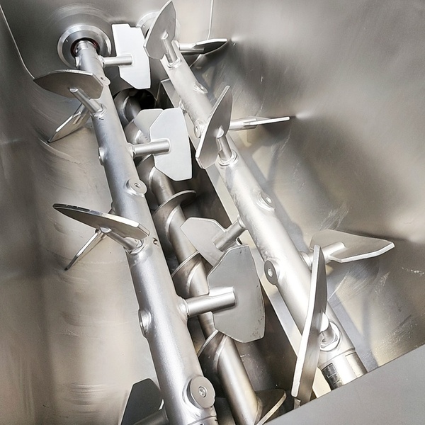 Kilia double shaft mixer-grinder with lifter for meat bins, capacity: 1000 liter, dimensions: 3500 mm x 2950 mm x 2400 mm.