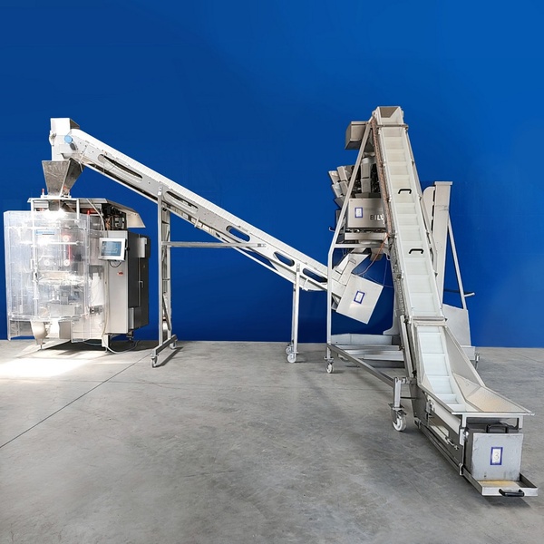 Bilwinco/Hassia packaging line, consisting of: Bilwinco 10-heads multihead weigher, type: BW110-W, year of construction: 2006, 400 V, 3 Ph, 50 Hz, 5000 VA, 10 KA, air pressure: 5-10 bar, weighing range: 10 gram to 3000 gram, weighing scale dimensions: 135 mm x 220 mm x 345 mm, Hassia vertical bag form- fill and seal machine, type: FB BI-400-IS, machine number: 152-710, year of construction: 2006, 230/400 V, 3 Ph, 50 Hz, 35 A, 23 kVA, dimensions: 1750 mm x 2700 mm x 2850 mm. Including 2 conveyors, dimensions: 4350 mm x 1400 mm x 3400 mm.