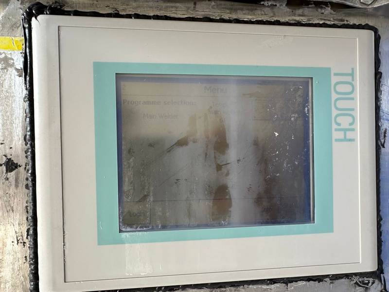 Attec Food Technology film wrapping machine with in- and outfeed transport belts, type: FWAL, series: 453, order number: 15860-001, year of construction: 2004, seal length: 1050 mm, plastic belts, belt width: 1000 mm and 750 mm, total dimensions: 6200 mm x 1700 mm x 1830 mm.