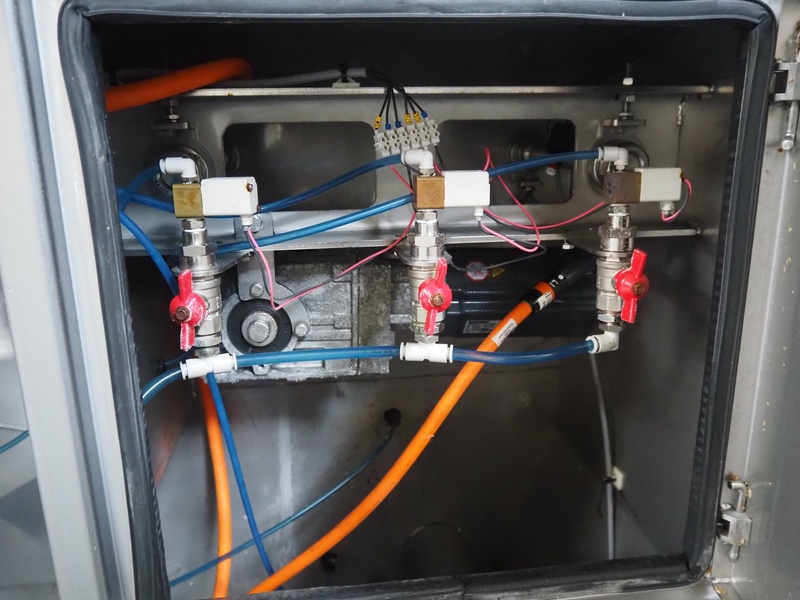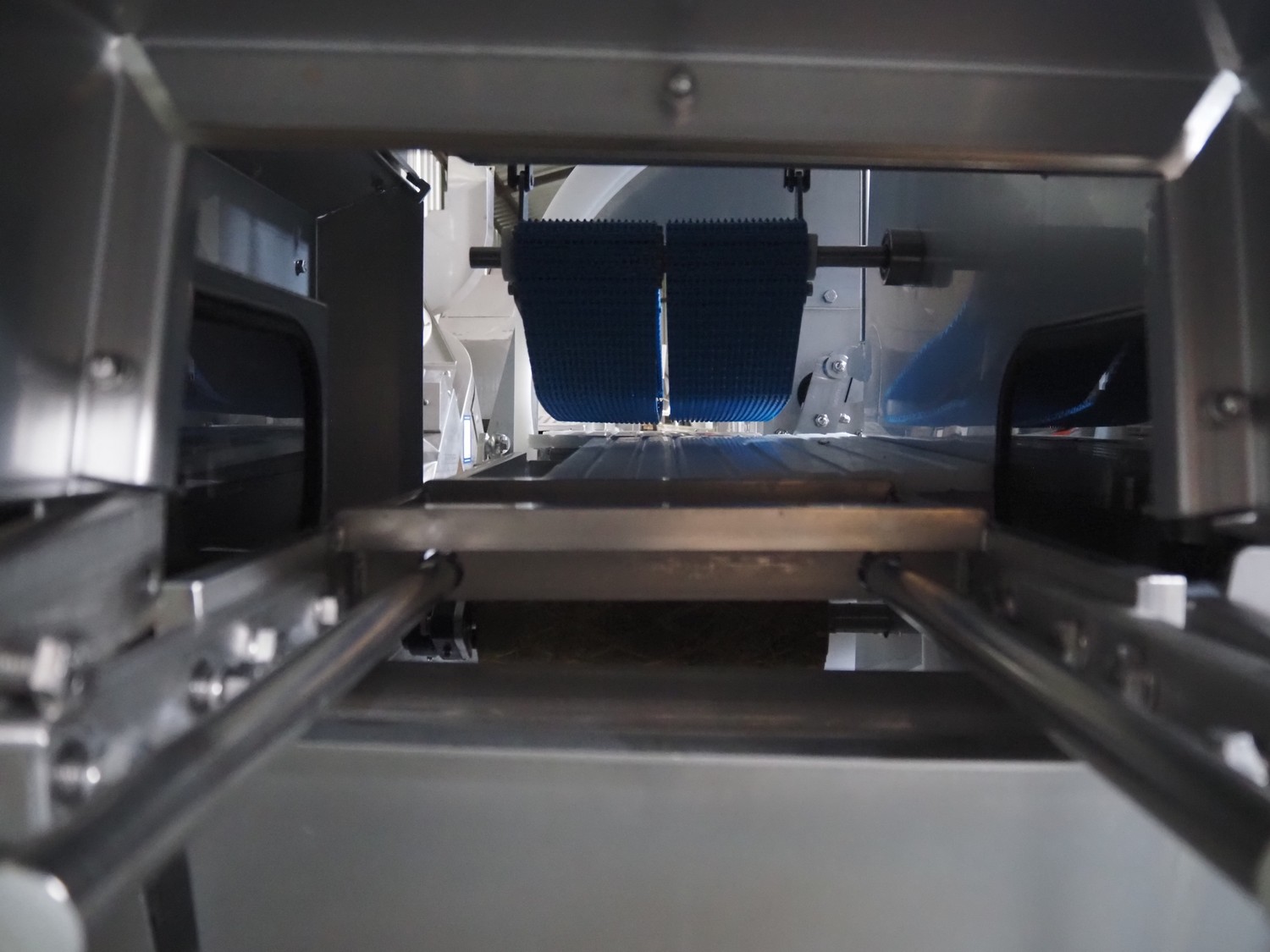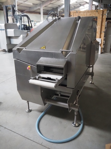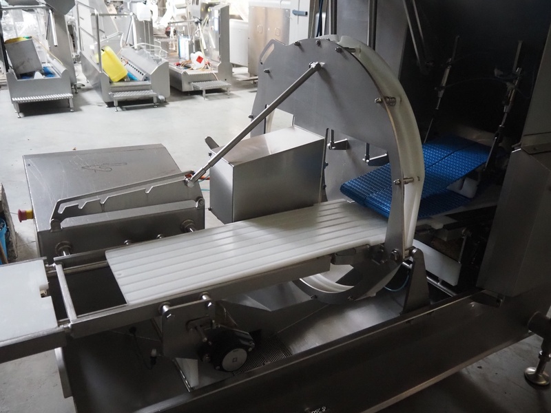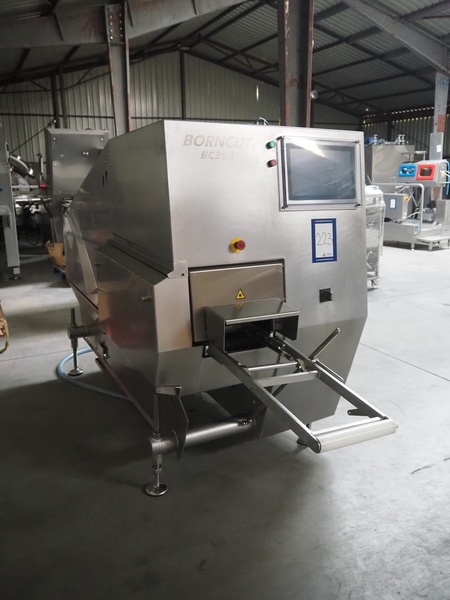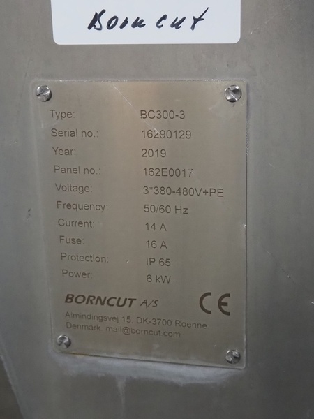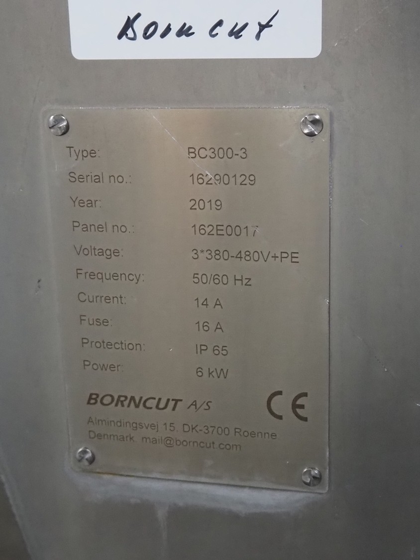 Borncut A/S portioning machine, type: BC300-3, serial number: 16290129, year of construction: 2019, 380/400 V, 3 Ph, 50/60 Hz, 14/16 A, 6 kW, plastic mesh belt, belt width: 300 mm, clearance: 320 mm x 125 mm, total dimensions: 3200 mm x 1200 mm x 1800 mm. Missing in- and outfeed belt.