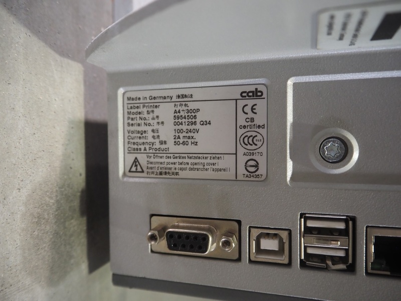 CAB label printer, model: A4+/300P, serial number: 0041296 Q34, 100/240 V, 1 Ph, 50/60 Hz, dimensions: 450 mm x 240 mm x 275 mm. Missing cover.