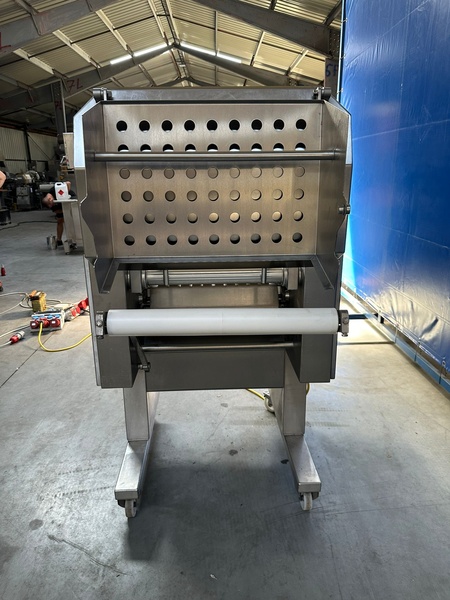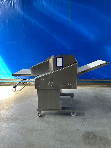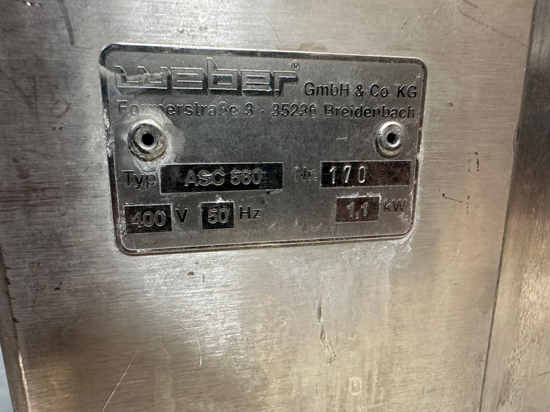 Weber Maschinenbau GmbH mobile skinning and derinding machine, type: ASC 560, number: 170, 400 V, 50 Hz, 1.1 kW, plastic belt, belt width: 500 mm, working width: 550 mm, total dimensions: 2000 mm x 1100 mm x 1340 mm.