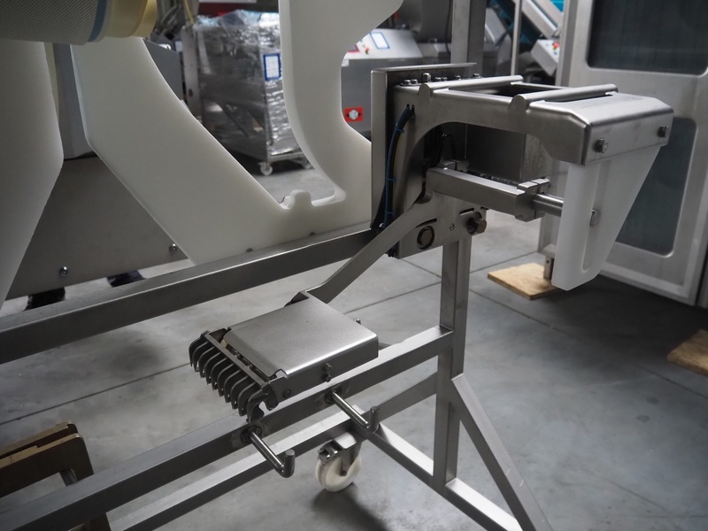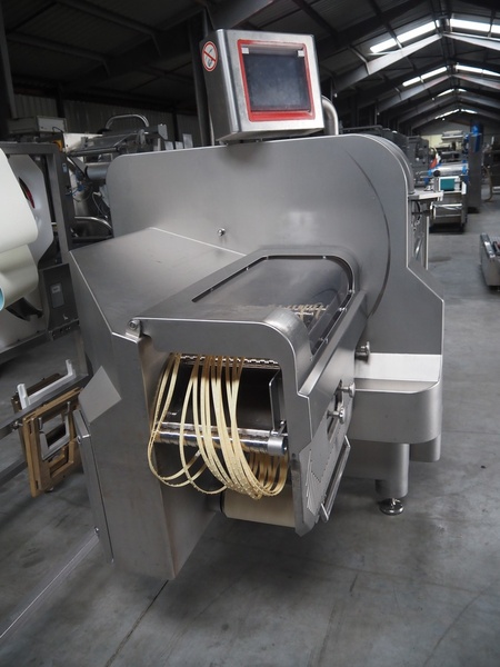 Treif Maschinenbau GmbH slicer and portion cutter, type: FALCON conti, machine number: 461005.154538.109916, year of construction: 2010, 24/380/480 V, 3 Ph, 50/60 Hz, 18/22/32 A, 8.6/11.7 kW, clearance: 260 mm x 220 mm, dimensions: 4300 mm x 1400 mm x 1900 mm. Including s/s tool trolley with knife holders, dimensions trolley: 1400 mm x 750 mm x 1600 mm.