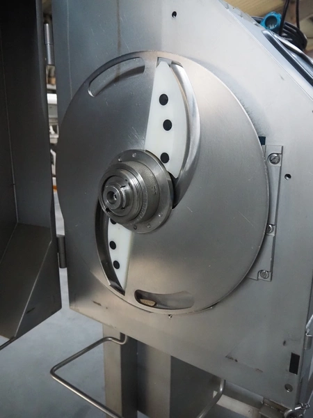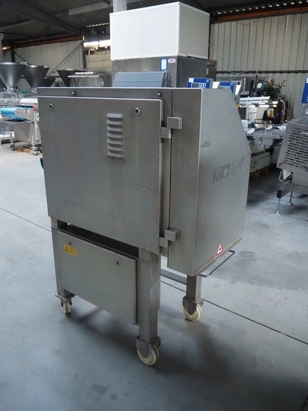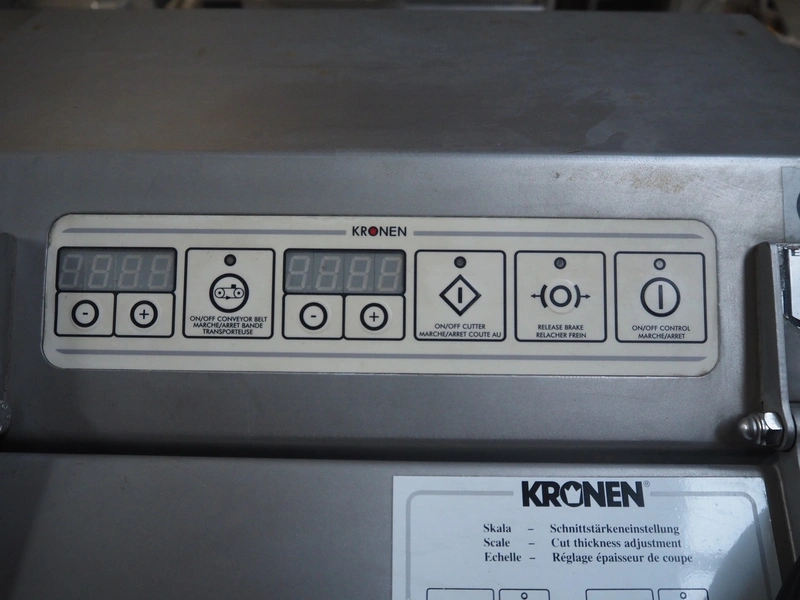 Kronen mobile slicer, type: GS10, serial number: 1043, year of construction: 2002, 230 V, 1 Ph, 50/60 Hz, 1.8 kW, plastic belt, belt width: (2x) 130 mm, total dimensions: 1500 mm x 650 mm x 145 mm. Belt broken.