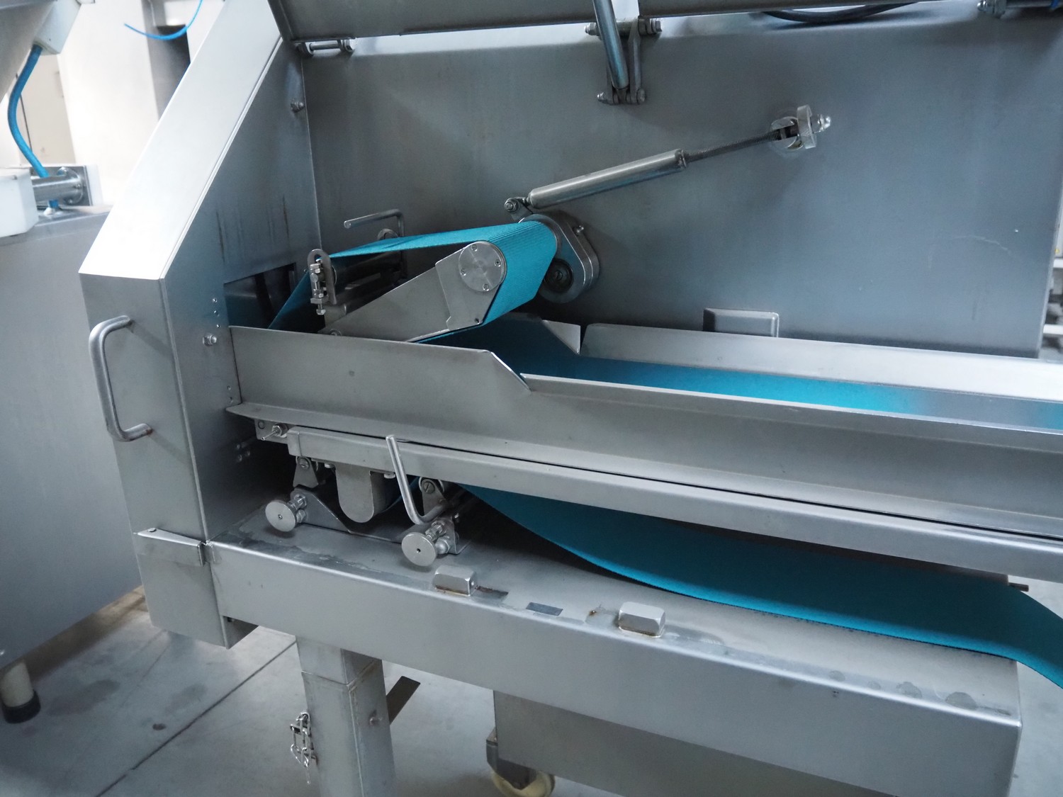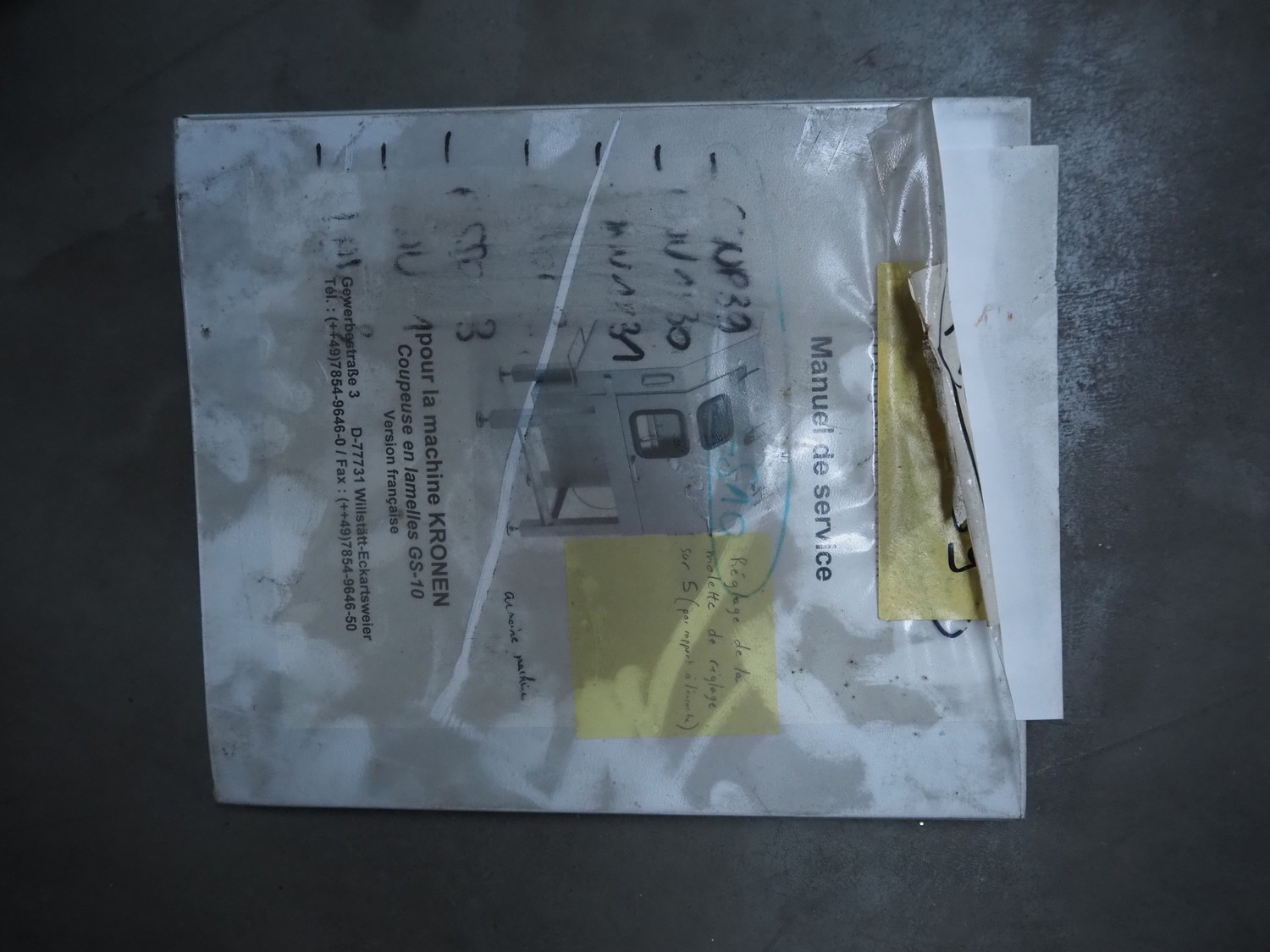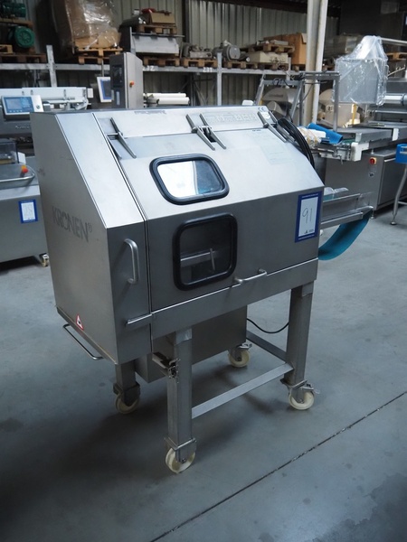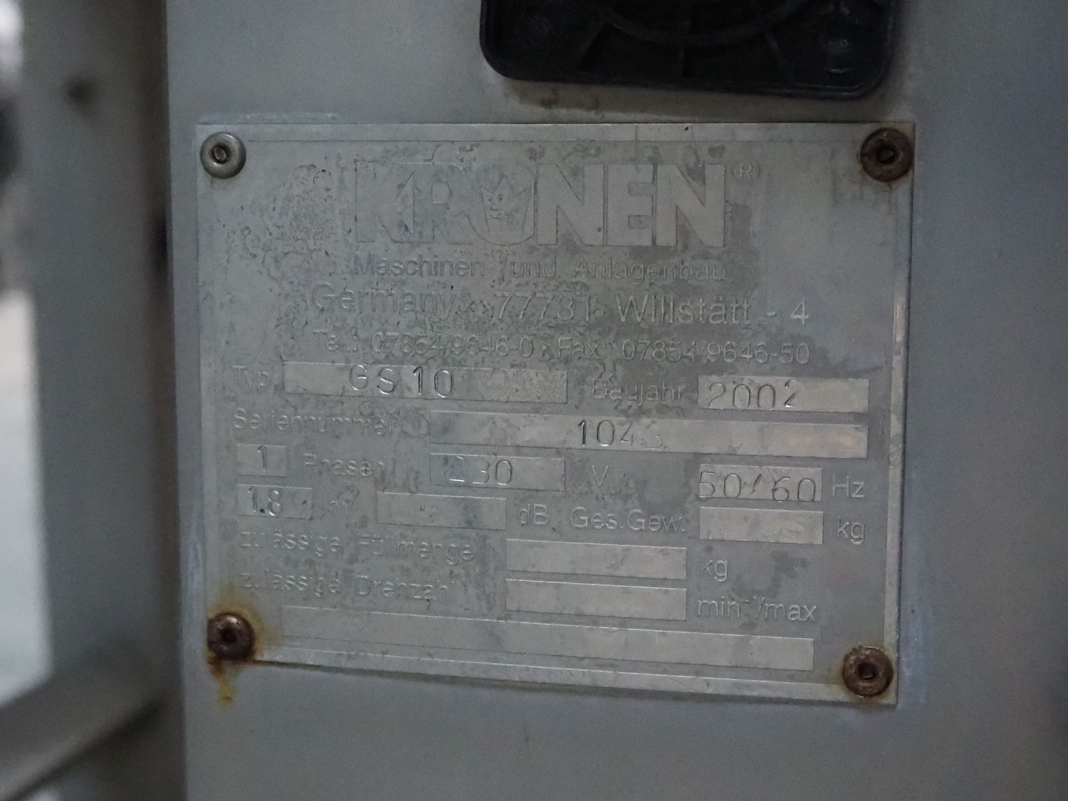 Kronen mobile slicer, type: GS10, serial number: 1043, year of construction: 2002, 230 V, 1 Ph, 50/60 Hz, 1.8 kW, plastic belt, belt width: (2x) 130 mm, total dimensions: 1500 mm x 650 mm x 145 mm. Belt broken.