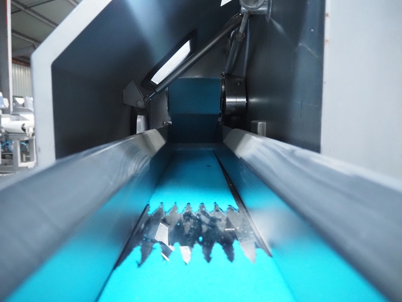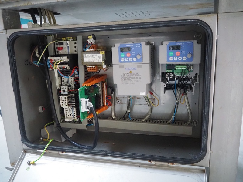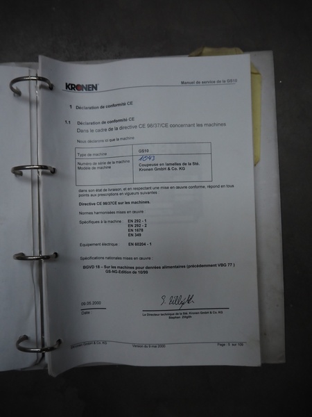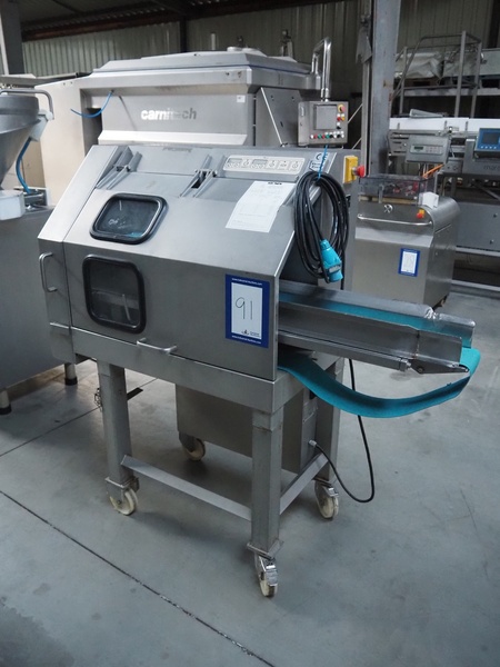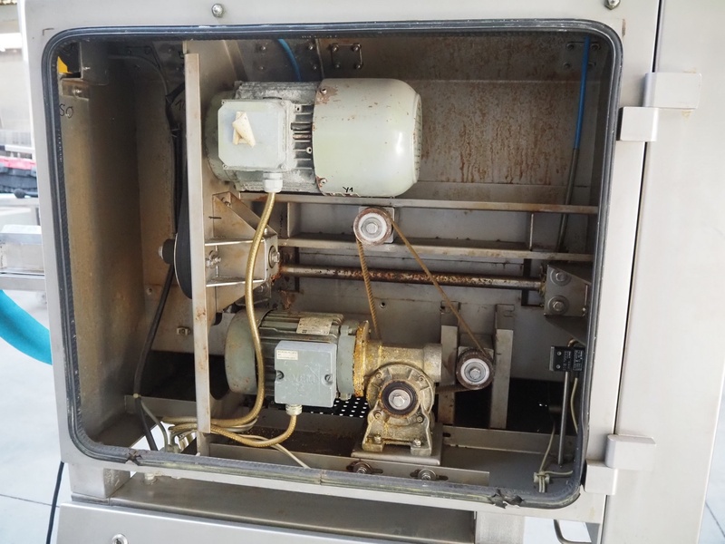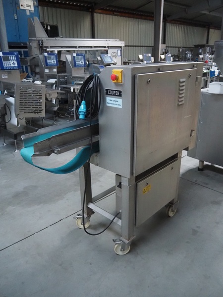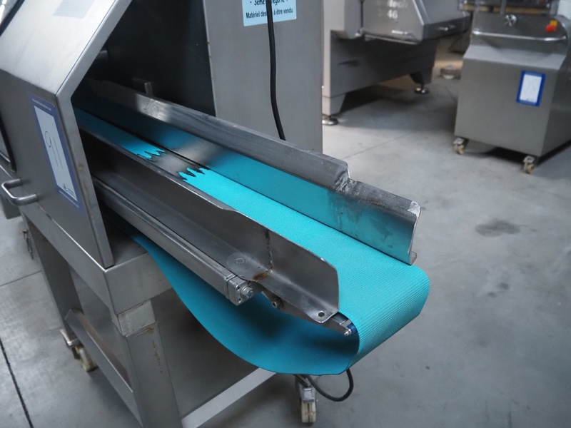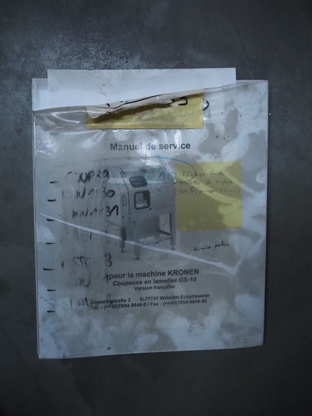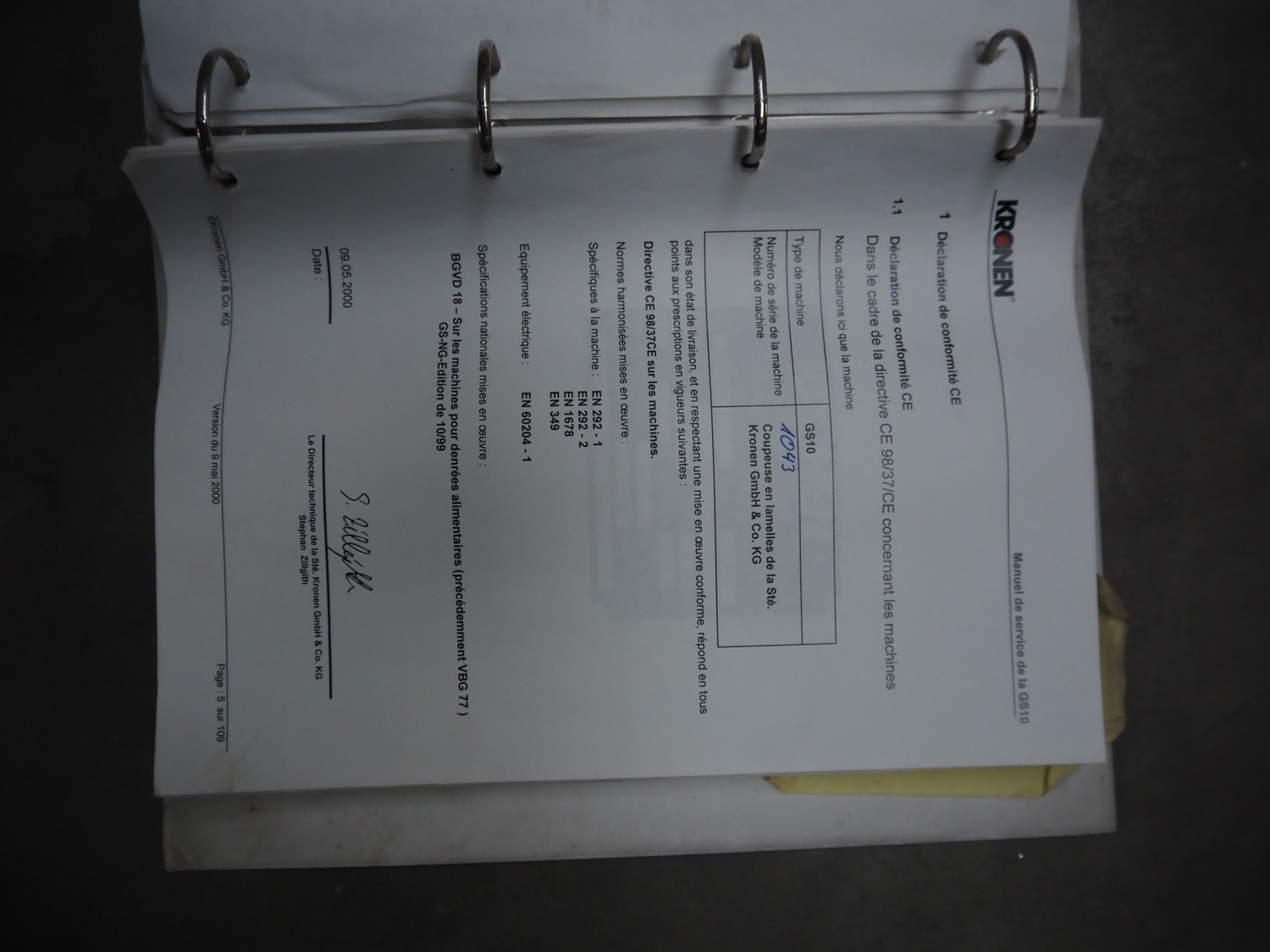 Kronen mobile slicer, type: GS10, serial number: 1043, year of construction: 2002, 230 V, 1 Ph, 50/60 Hz, 1.8 kW, plastic belt, belt width: (2x) 130 mm, total dimensions: 1500 mm x 650 mm x 145 mm. Belt broken.