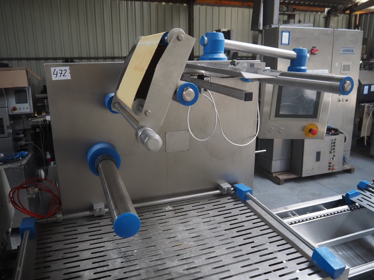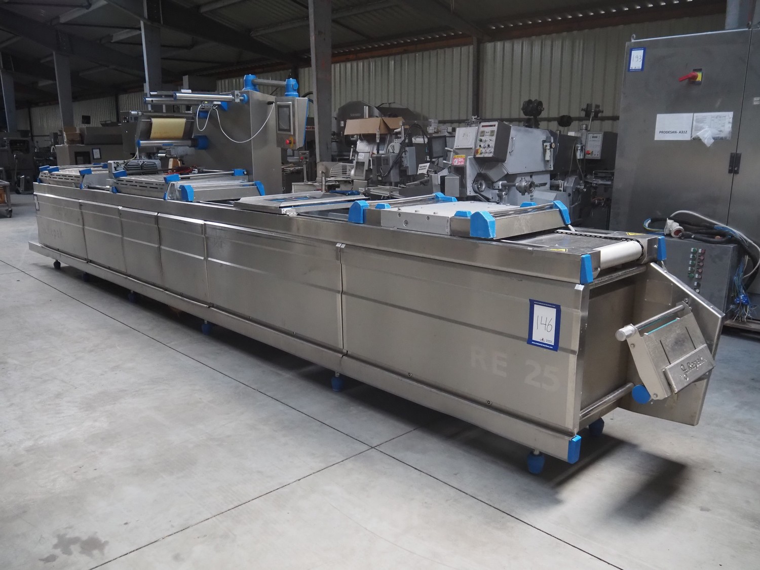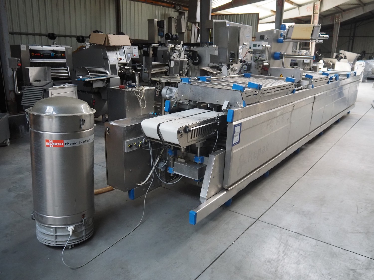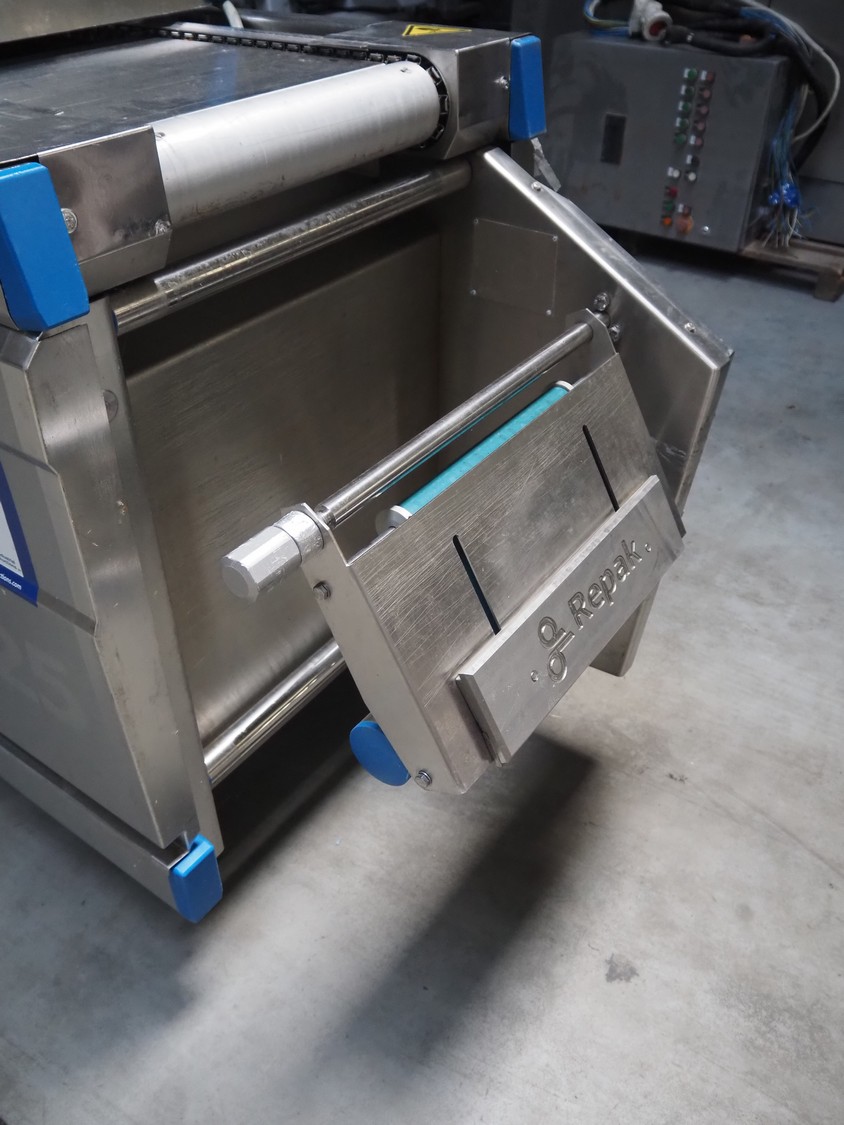 Repak thermoformer, type: RE 25, serial number: 250003, year of construction: 2005, 240/400 V, 3 Ph, 50 Hz, 32 A, 13 kW, dye: 185 mm x 125 mm, index: 450 mm x 415 mm, with Busch vacuum pump, total dimensions: 8500 mm x 1200 mm x 2000 mm. Including Busch suction device for rest film.