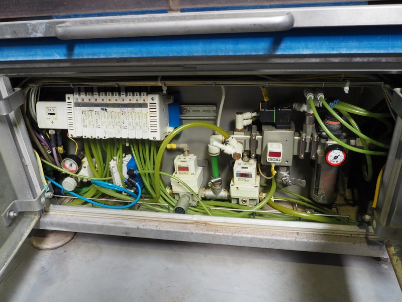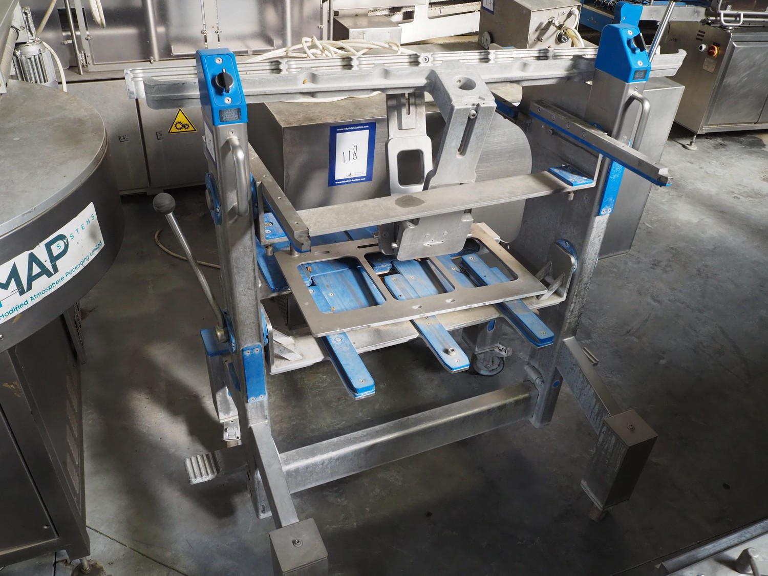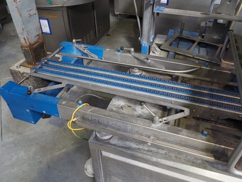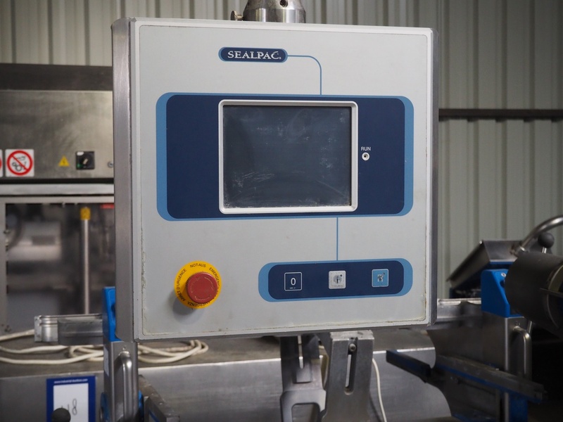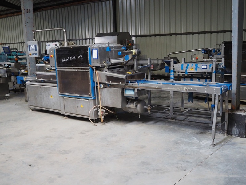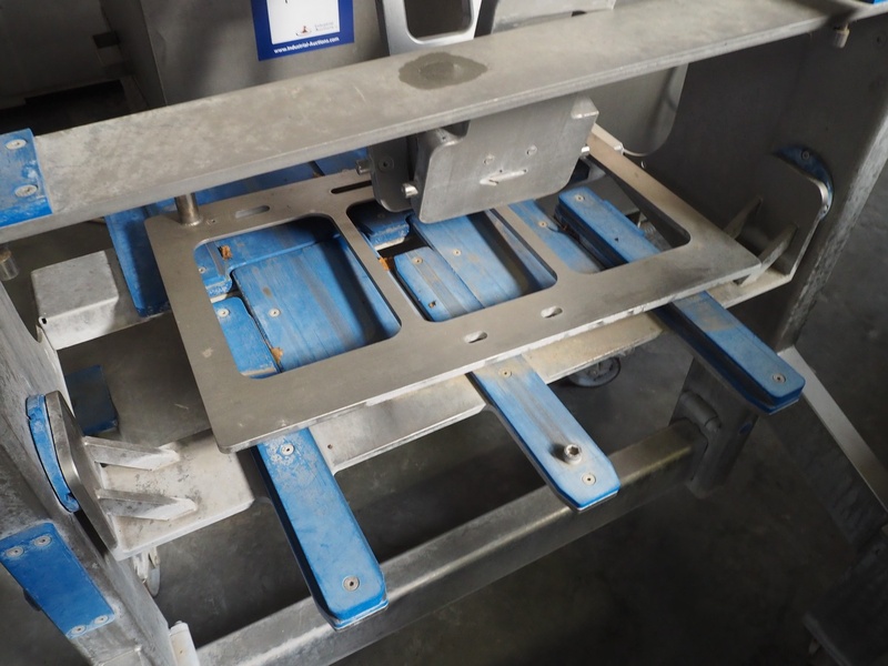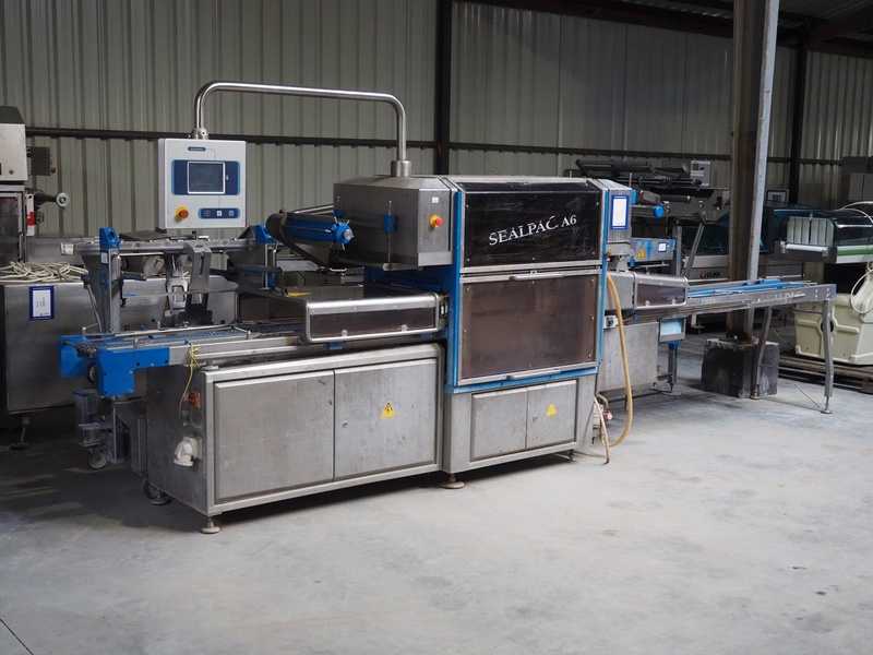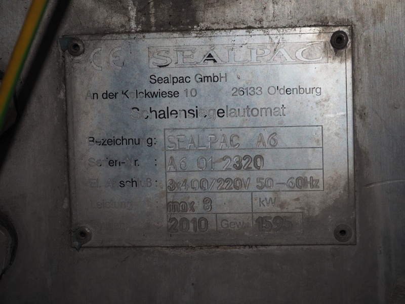 Sealpac GmbH traysealer, type: SEALPAC A6, serial number: A6 01 2320, year of construction: 2010, 3x400/220 V, 50-60 Hz, 8 kW, weight: 1595 kg, dimensions dye: (3x) 280 mm x 180 mm, outfeed lane width: 125 mm, total dimensions traysealer: 5500 mm x 850 mm x 2100 mm. Including s/s rack with extra form, dimensions dye: (4x) 240 mm x 140 mm, total dimensions rack: 1800 mm x 660 mm x 1280 mm, and s/s trolley to change forms, dimensions: 1100 mm x 800 mm x 1450 mm.