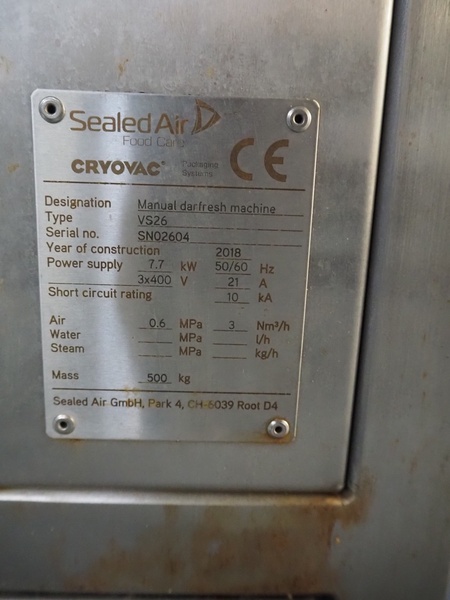 Cryovac manual darfresh machine (skin packer), type: VS26, serial number: SN02604, year of construction: 2018, 400 V, 3 Ph, 50/60 Hz, 21 A, weight: 500 Kg, seal length: 560 mm, dimensions chamber: 720 mm x 530 mm, dimensions dye: (8x) 240 mm x 150 mm, with Gardner Denver vacuum pump, type: V-VC 202, total dimensions: 1600 mm x 1040 mm x 1220 mm. Including pallet with film rolls, film width: 560 mm.