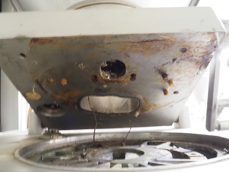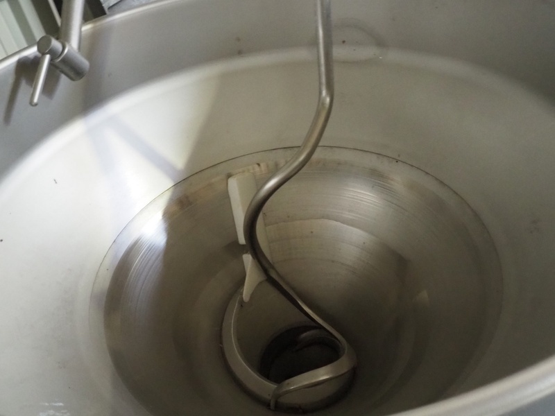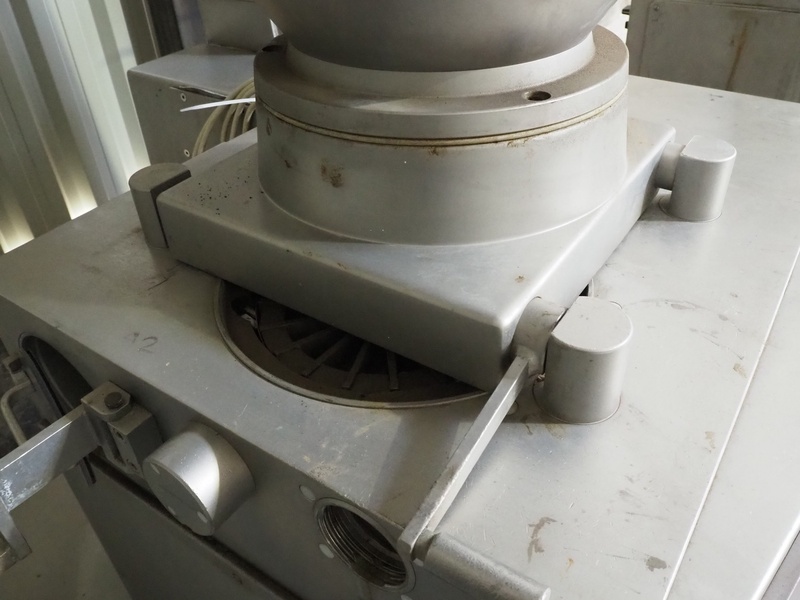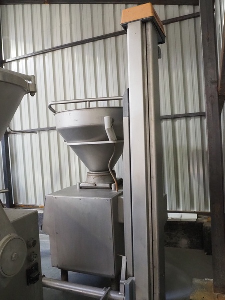 Handtmann vacuum filling machine with lifter for 200 liter meat bins, type: VF300B, number: 573, 380 V, 50 Hz, 25.7 A, 10.9 kW, filling and portioning, dimensions: 1900 mm x 1400 mm x 2870 mm. Incomplete.
