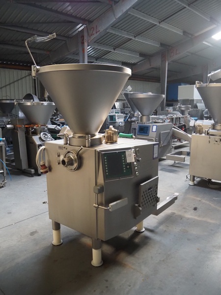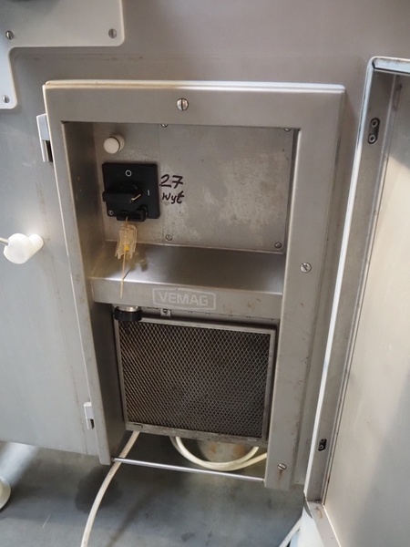 Vemag Maschinenbau GmbH vacuum filling machine with lifter for 200 liter meat bins, type: HP10E, number: 1610384, year of construction: 2010, 400-460 V, 3 Ph, 50/60 Hz, 21 A, 14 kW, dimensions: 2100 mm x 1500 mm x 2400 mm.