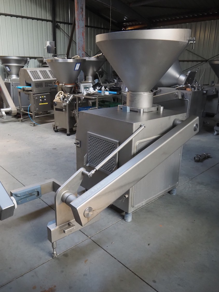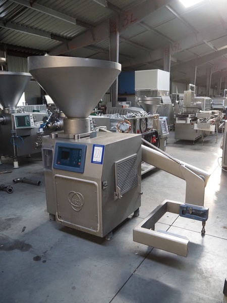 Risco S.p.A. vacuum filling machine with lifter for 200 liter meat bins, type: RS 505, serial number: C806029, year of construction: 2007, 400 V, 3 Ph, 50 Hz, 11 kW, machine weight: 1000 kg, total dimensions: 2000 mm x 1400 mm x 2100 mm.