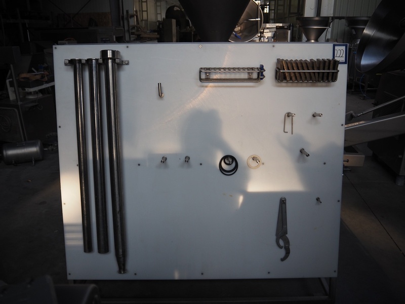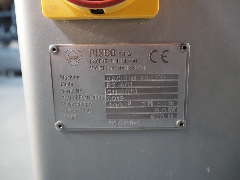 Risco S.p.A. vacuum filling machine, type: RS 401, serial number: 01118019, year of construction: 2019, 400 V, 3 Ph, 50 Hz, 8 kW, machine weight: 900 kg, dimensions: 2000 mm x 1400 mm x 2100 mm. Including tool trolley, dimensions: 1500 mm x 800 mm x 750 mm.