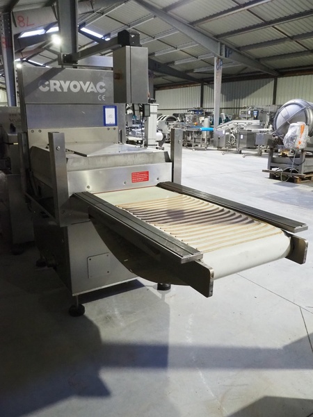 Cryovac belt vacuum machine, model: VS 85, serial number: A03600404, year of construction: 1998, 400 V, 3 Ph, 50 Hz, 20 A, 7 kW, plastic belt, belt width: 535 mm, total dimensions: 2600 mm x 1100 mm x 2050 mm.