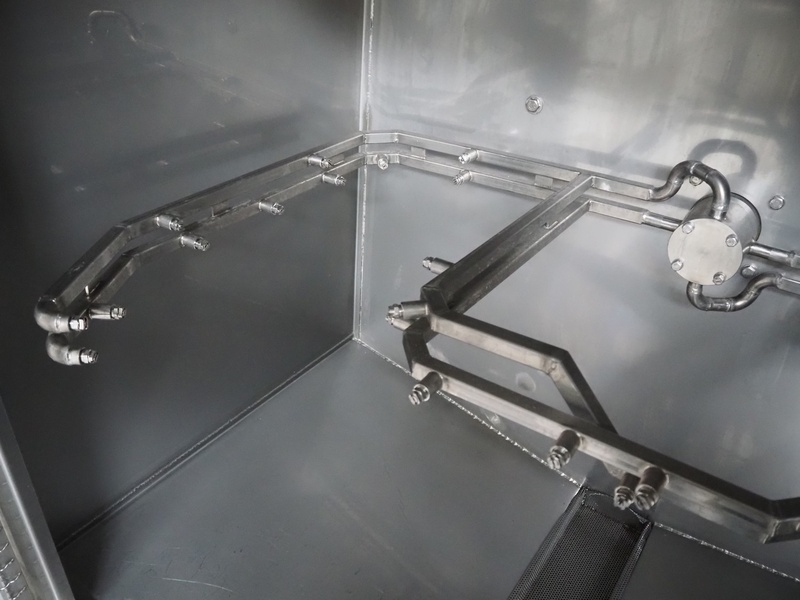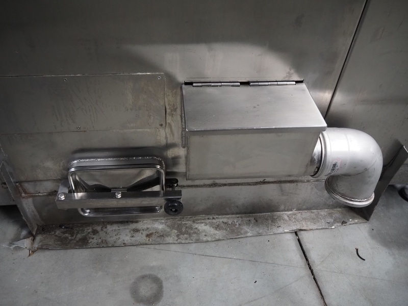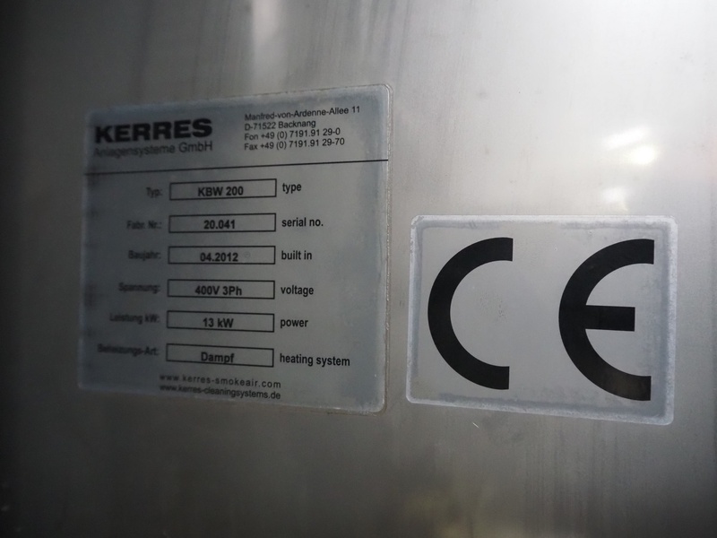 Kerres meat bin washer for 200 liter meat bins, type: KBW 200, serial number: 20.041, year of construction: 04/2012, 400 V, 3 Ph, 13 kW, heating system: steam, clearance: 1120 mm x 1150 mm, total dimensions: 3580 mm x 1700 mm x 2500 mm.