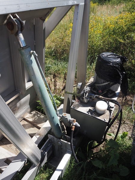 S/s tilting device for pallet boxes, clearance: 1600 mm x 1100 mm, total dimensions: 2200 mm x 1400 mm x 1800 mm.