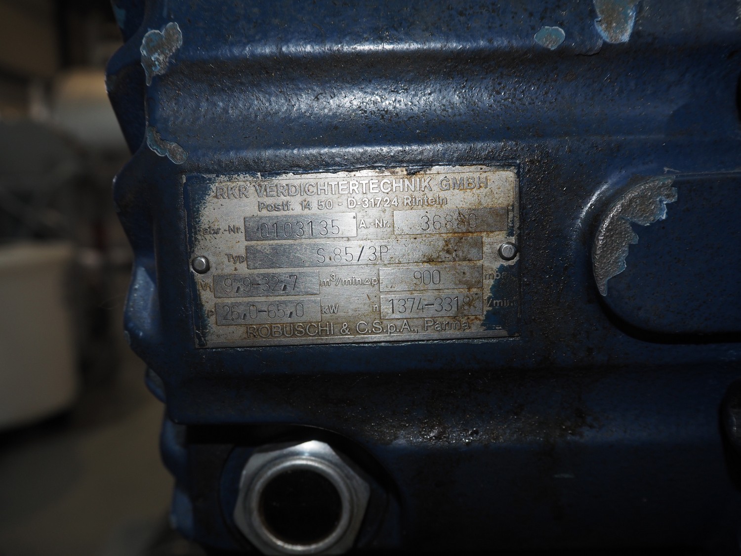 2 RKR Gebläse und Verdichter GmbH positive displacement blowers, type: S85/3P-BS35AT, fabrication number: 994881AT and 0103135, 26.0-65.0 kW, dimensions: 1730 mm x 1500 mm x 1500 mm. Including 3 pallets with extra parts, dimensions: 1600 mm x 1570 mm x 620 mm, 1700 mm x 900 mm x 480 mm, 1200 mm x 800 mm x 500 mm.