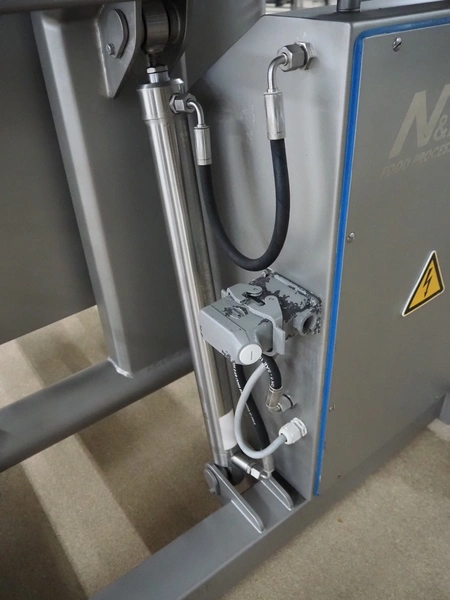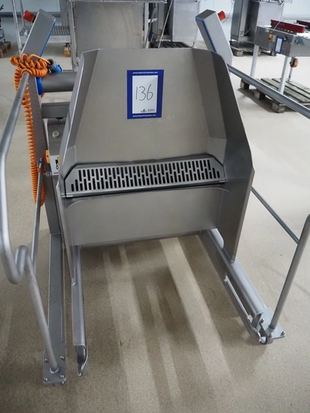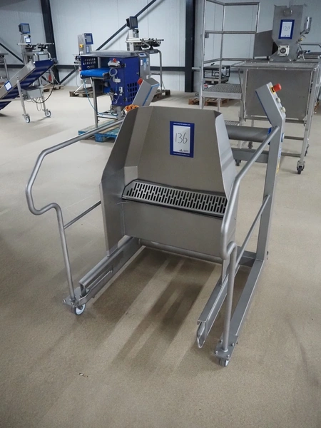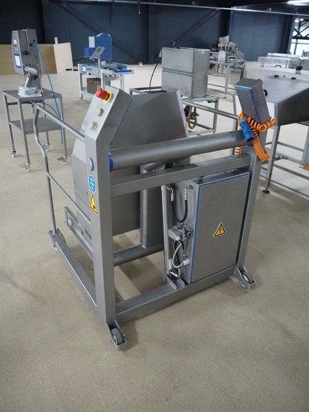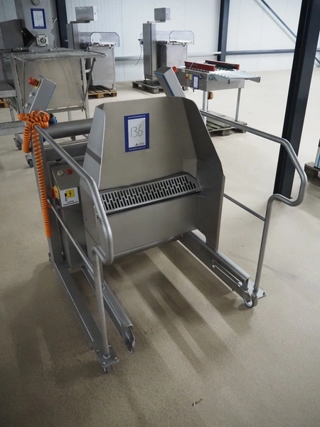 N&N mobile tilting device for meat bins, type: SWING LOADER PZ-3/250, serial number: 1004, year of construction: 2016, 230 V, 50 Hz, 0.75 kW, weight: 186 kg, capacity: 250 kg, dimensions: 1300 mm x 1000 mm x 1300 mm.