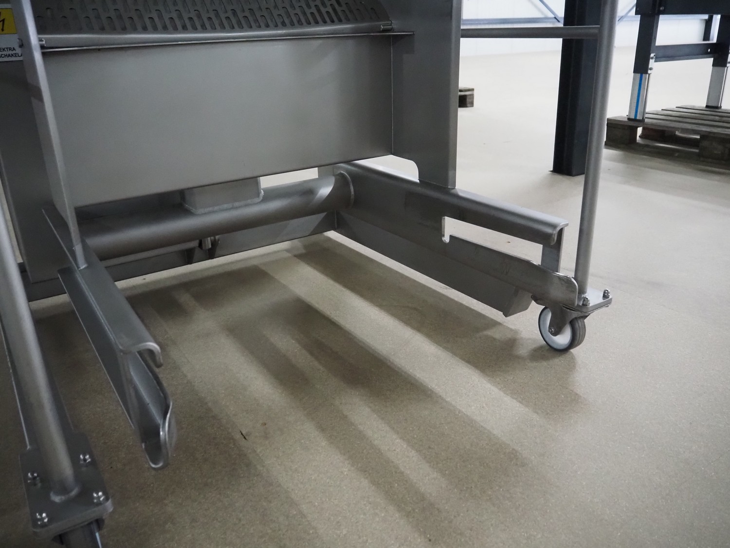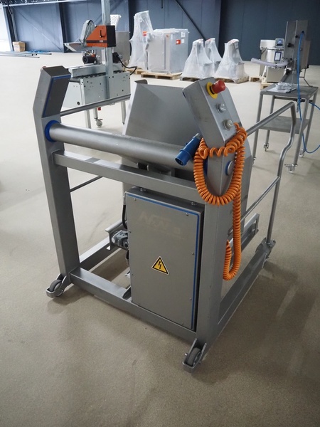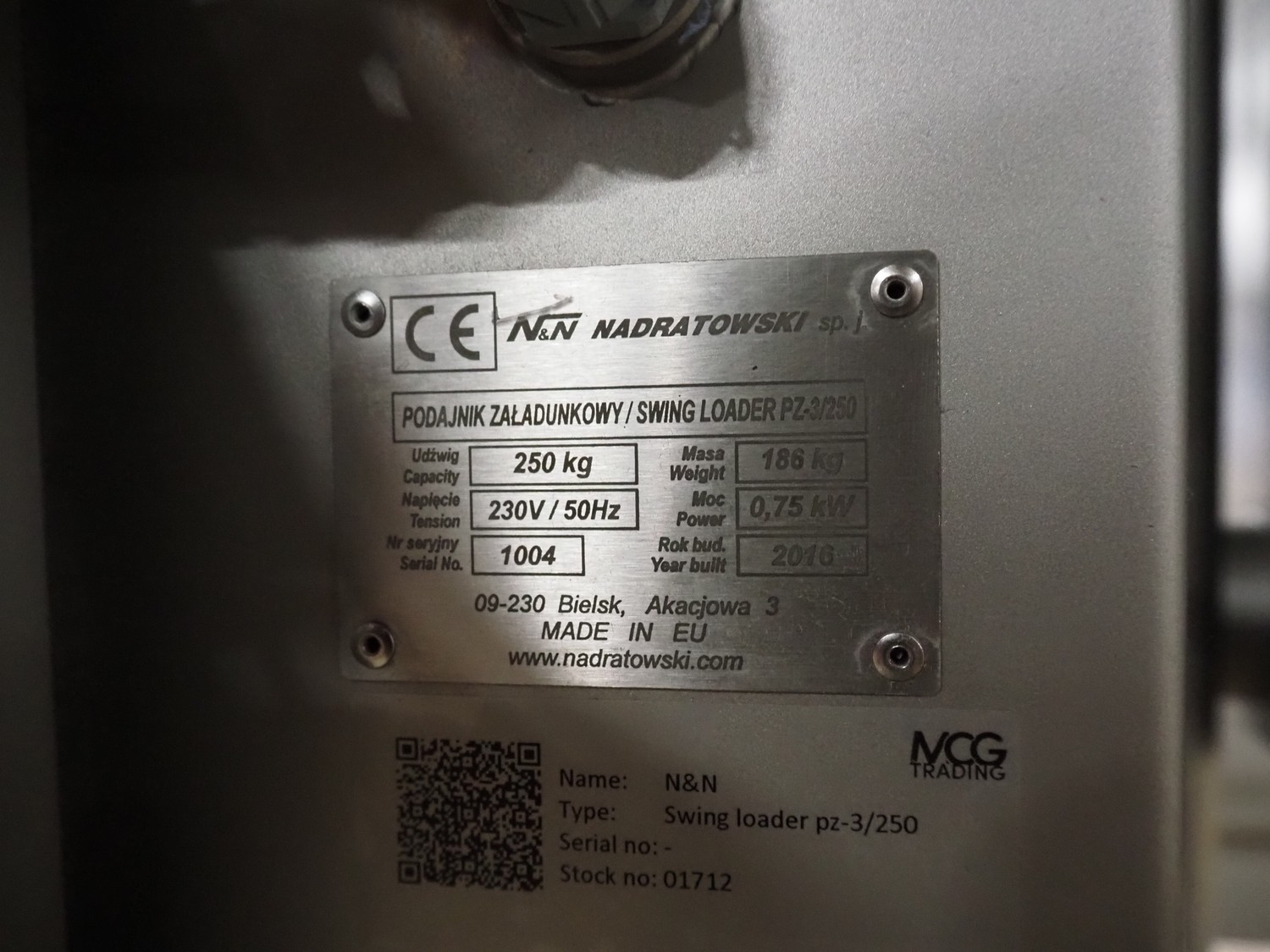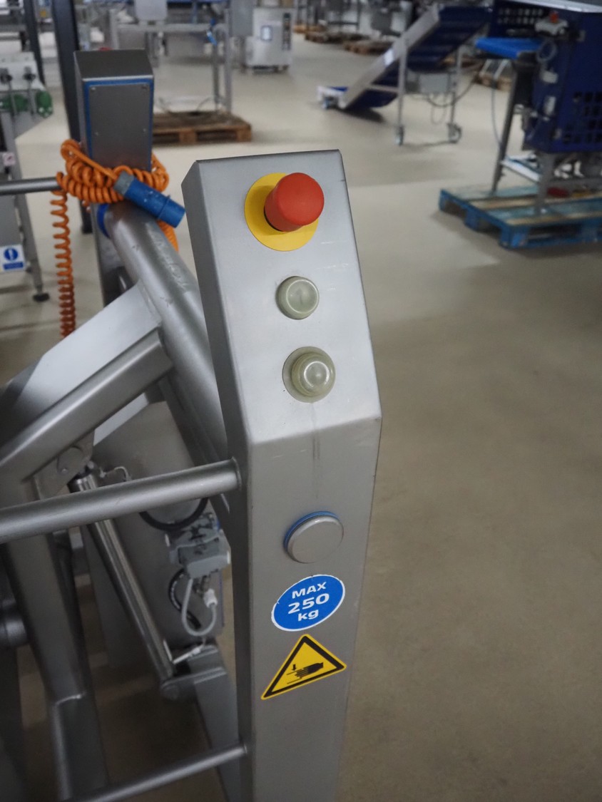N&N mobile tilting device for meat bins, type: SWING LOADER PZ-3/250, serial number: 1004, year of construction: 2016, 230 V, 50 Hz, 0.75 kW, weight: 186 kg, capacity: 250 kg, dimensions: 1300 mm x 1000 mm x 1300 mm.