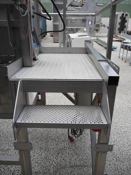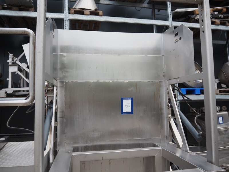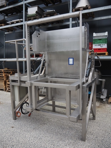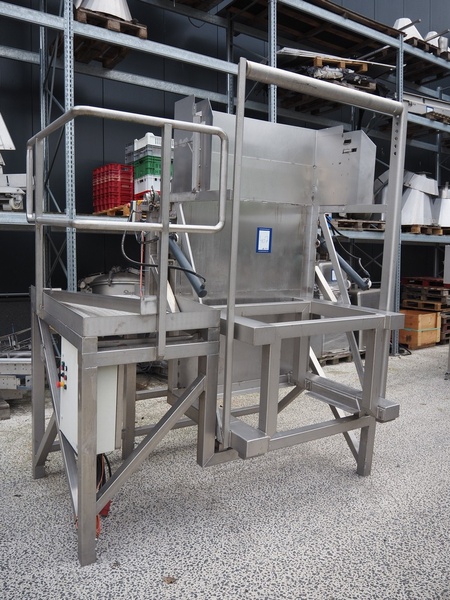 S/s tilting device for pallet boxes, clearance: 670 mm x 990 mm x 670 mm, total dimensions: 2500 mm x 1900 mm x 2750 mm.