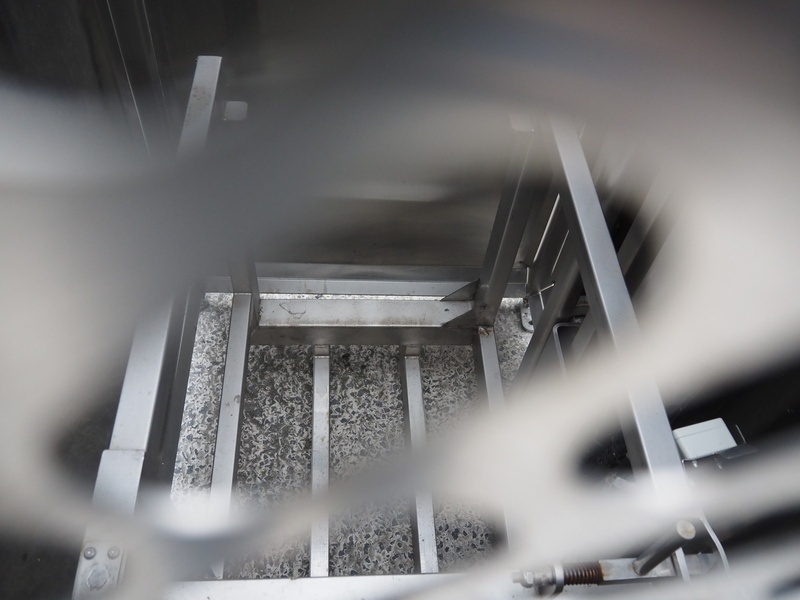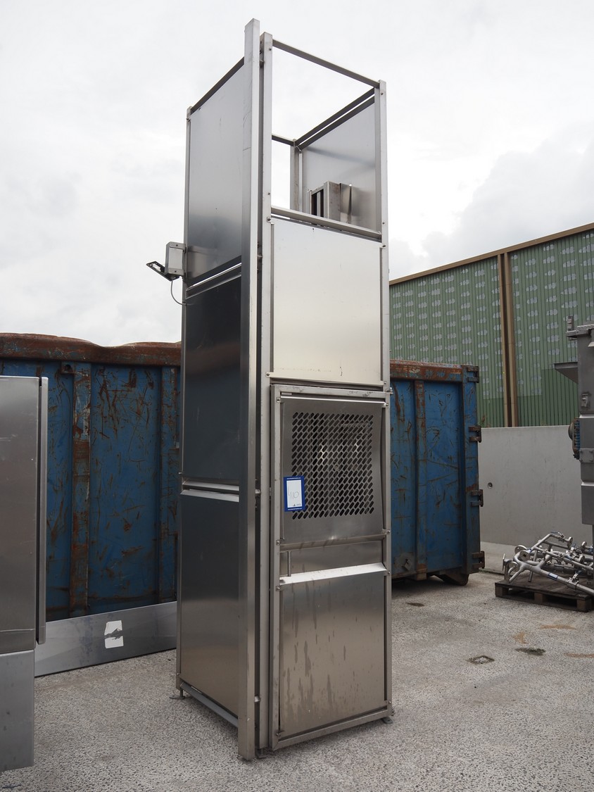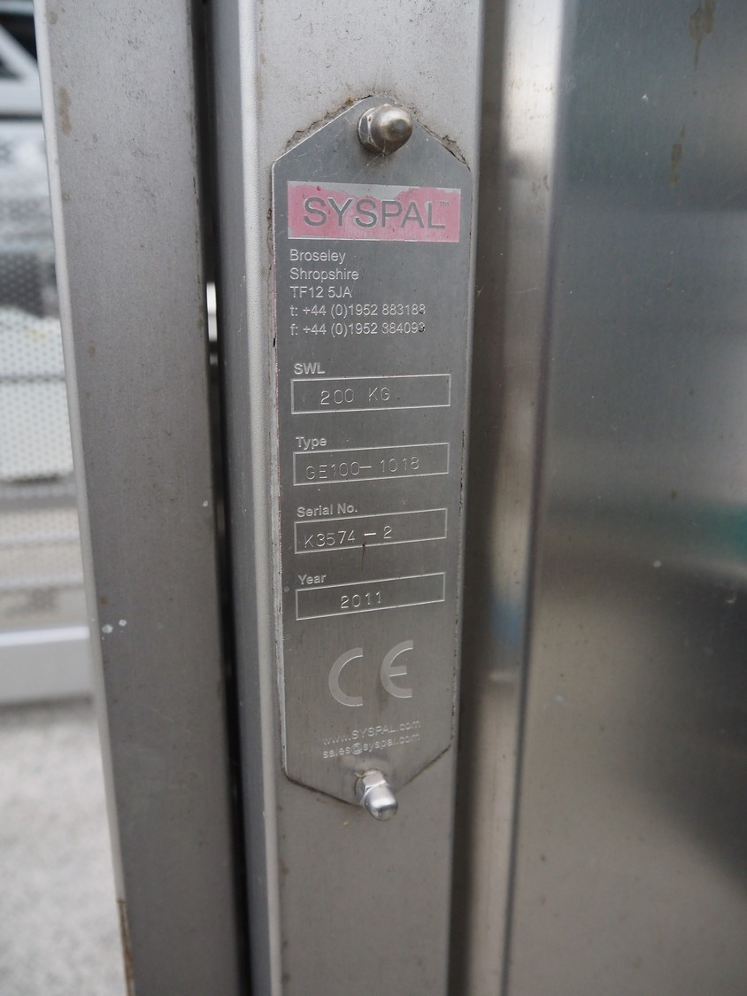 Syspal lifter for 200 liter meat bins, type: GE100-1018, serial number: K3574-2, year of construction: 2011, safe working load: 200 kg, lifting height: 2650 mm, total dimensions: 1150 mm x 1150 mm x 4170 mm. Damaged.