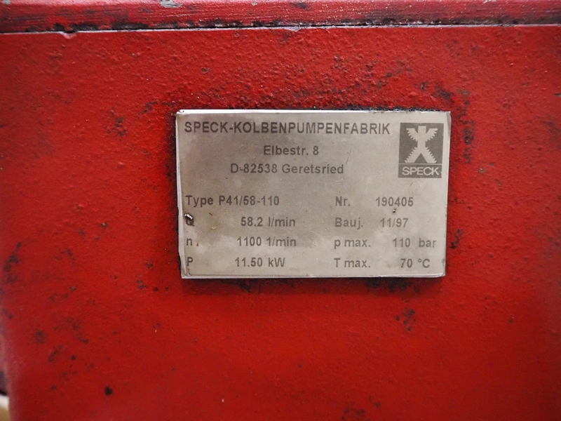 Jures / Speck high pressure unit, type: P41/58-110, number: 190405, year of construction: 11/97, 400 V, 11.50 kW, P maximum: 110 bar, T maximum: 70°C, dimensions: 1300 mm x 900 mm x 1400 mm.