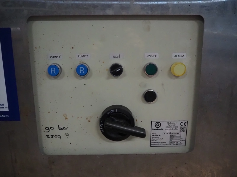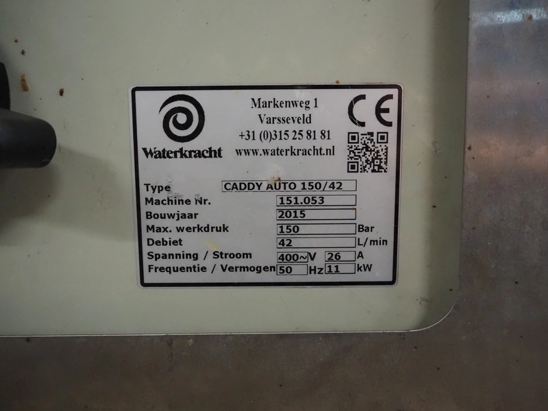 Waterkracht stationary high-pressure installation, type: CADDY AUTO 150/42, machine number: 151.053, year of construction: 2015, 400 V, 3 Ph, 50 Hz, 26 A, 11 kW, capacity: 42 l/min, dimensions: 900 mm x 470 mm x 1530 mm.