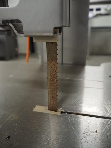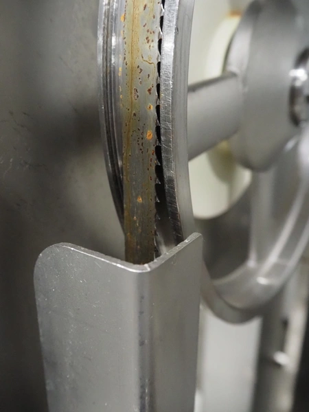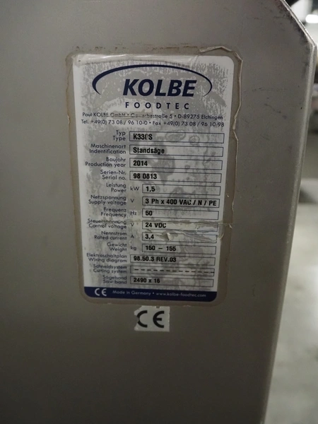 Kolbe bandsaw, type: K330S, serial number: 98 0813, year of construction: 2014, 400 V, 3 Ph, 50 Hz, 24 VDC, 3.4 A, 1.5 kW, weight: 150-155 kg, dimensions saw table: 760 mm x 580 mm, total dimensions: 760 mm x 720 mm x 1800 mm.
