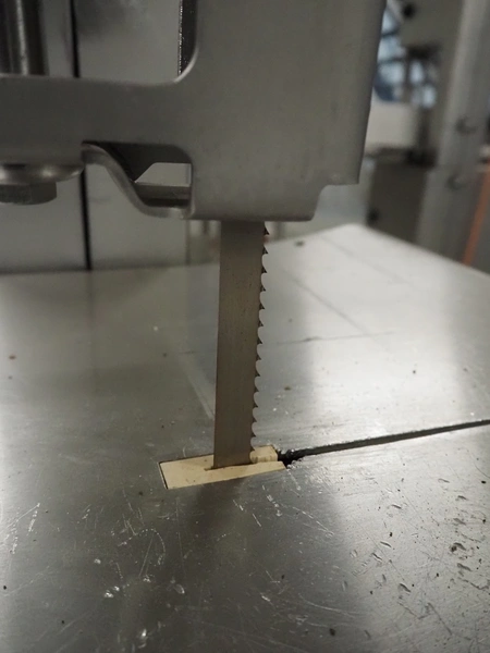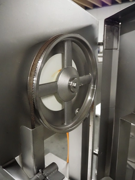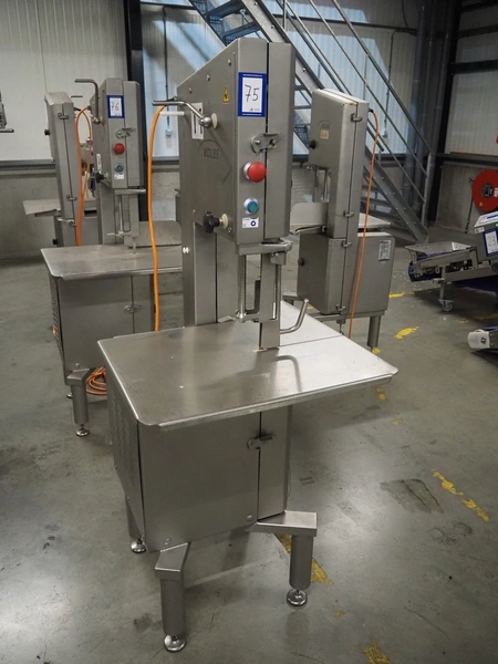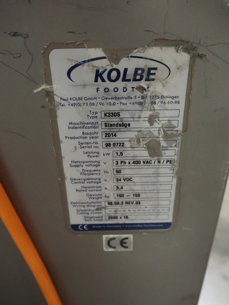 Kolbe bandsaw, type: K330S, serial number: 98 0722, year of construction: 2014, 400 V, 3 Ph, 50 Hz, 24 VDC, 3.4 A, 1.5 kW, weight: 150-155 kg, dimensions saw table: 760 mm x 580 mm, total dimensions: 760 mm x 720 mm x 1800 mm.