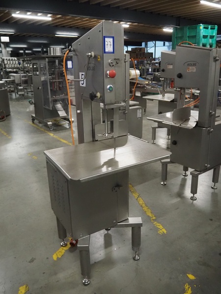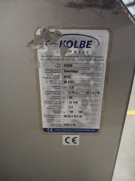 Kolbe bandsaw, type: K330S, serial number: 98 0721, year of construction: 2014, 400 V, 3 Ph, 50 Hz, 24 VDC, 3.4 A, 1.5 kW, weight: 150-155 kg, dimensions saw table: 760 mm x 580 mm, total dimensions: 760 mm x 720 mm x 1800 mm.