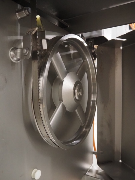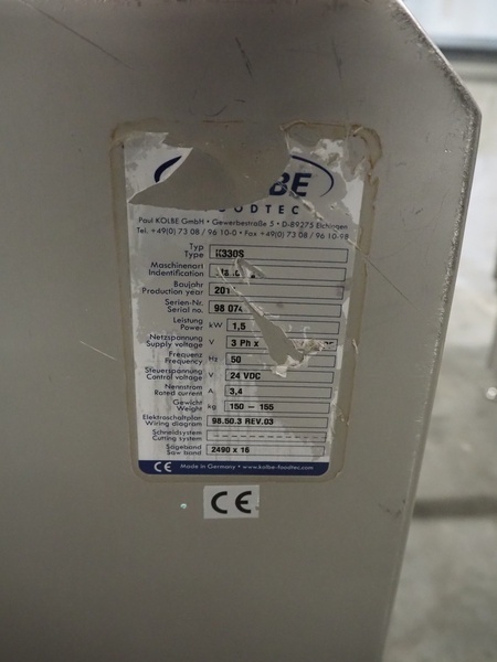 Kolbe bandsaw, type: K 330 S, serial number: 98 1082, year of construction: 2016, 400 V, 3 Ph, 50 Hz, 24 VDC, 3.4 A, 1.5 kW, weight: 150-155 kg, dimensions saw table: 760 mm x 580 mm, total dimensions: 760 mm x 720 mm x 1800 mm.