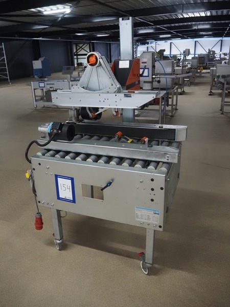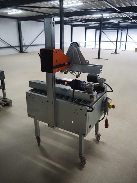 Soco System mobile box closing machine, model: T-10, machine number: 59-2007, year of construction: 2006, 400 V, 3 Ph, 50 Hz, 1.5 A, plastic rollers, roller width: 600 mm, clearance: 290 mm x 290 mm, total dimensions: 1100 mm x 850 mm x 1750 mm.