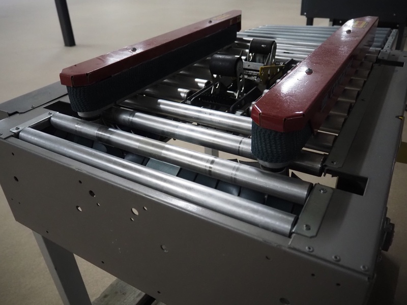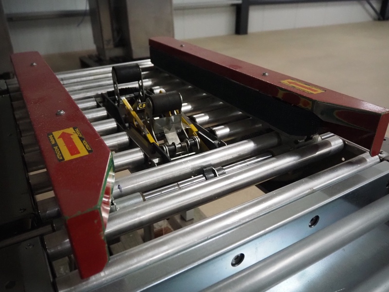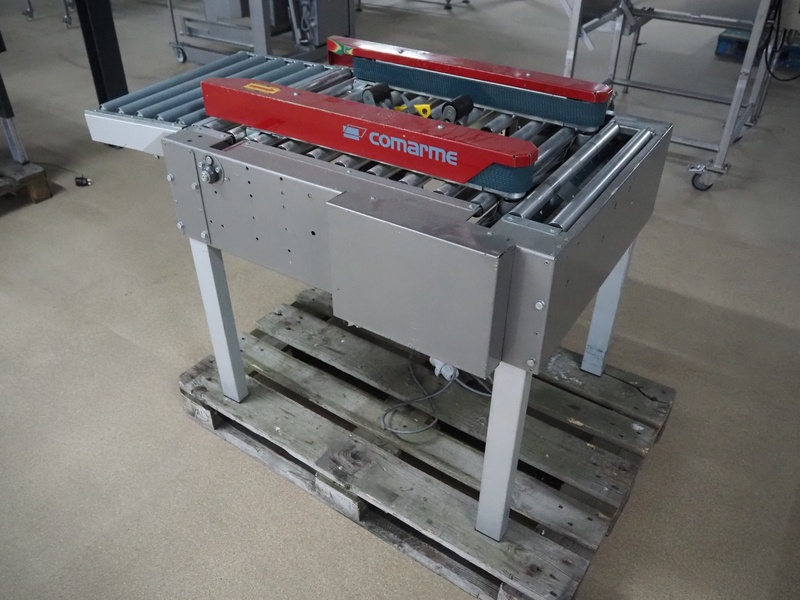 Comarme box closing machine with bottom taper, model: GEM/52, serial number: AW024368, year of construction: 2005, 400 V, 50 Hz. 0.8 A, 184 W, weight; 77 kg, steel rollers, roller width: 520 mm, plastic belt, belt width: 50 mm, total dimensions: 1300 mm x 830 mm x 850 mm.