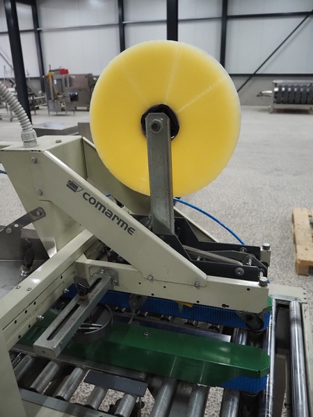 Comarme box closing machine, model: GEM-F47, serial number: AZ026005, year of construction: 2005, 400 V, 50 Hz, 1 A, 280 Watt, weight: 186 kg, dimensions: 900 mm x 1700 mm x 1600 mm.