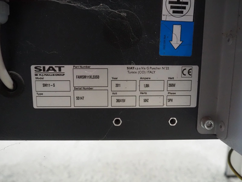 Siat box closing machine, model: SM11-S, serial number: 55147, year of construction: 2011, 380/415 V, 3 Ph, 50 Hz, 1.08 A, 260 Watt, dimensions: 1500 mm x 950 mm x 2000 mm.